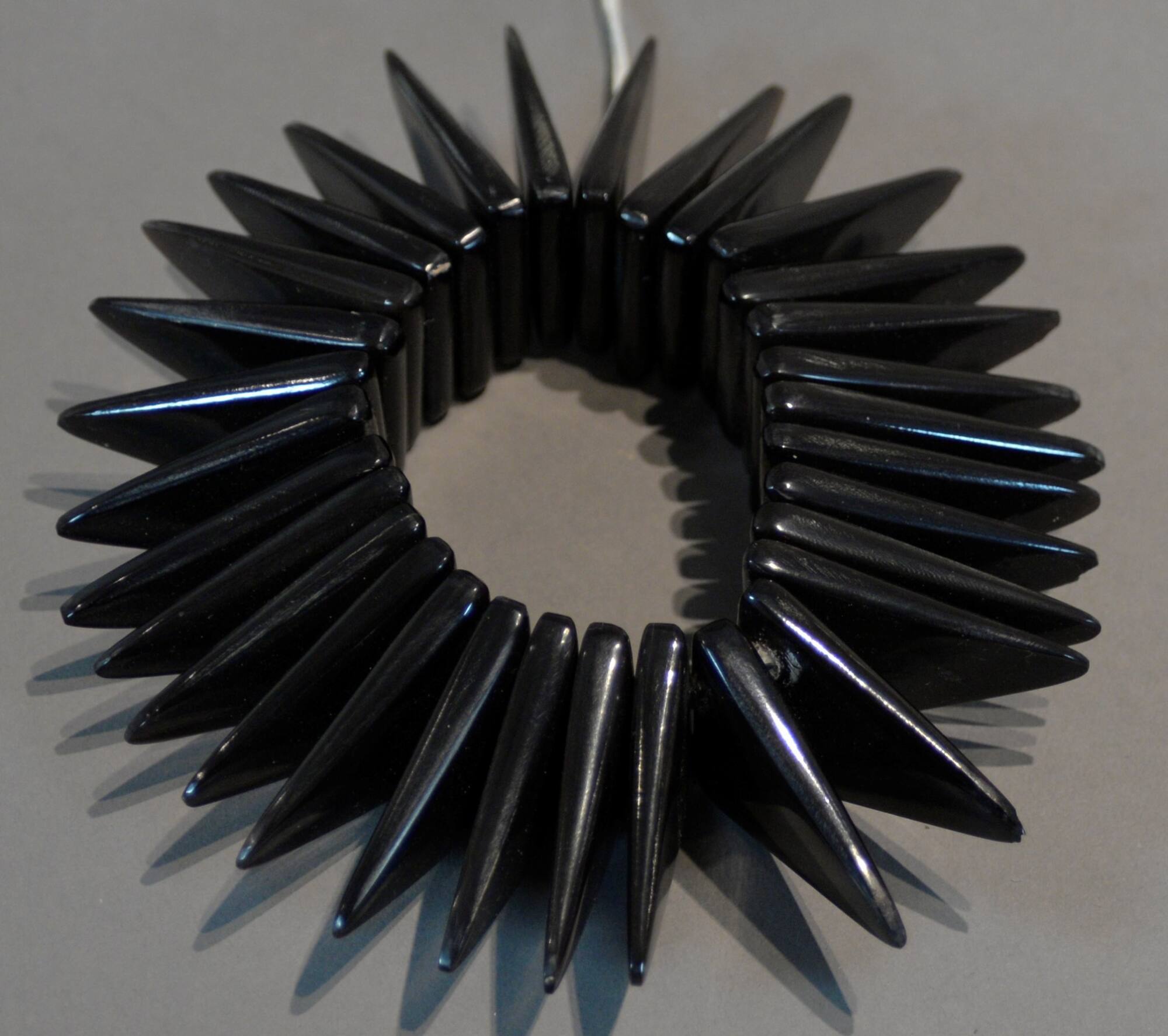 DescriptionA bracelet made with numerous dark flat horn triangles, attached with elsatic cord.