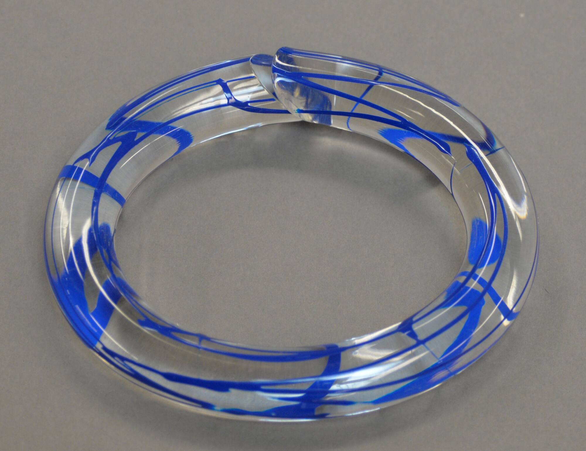 DescriptionFlat, oval shaped black plastic ring with clear streaks.