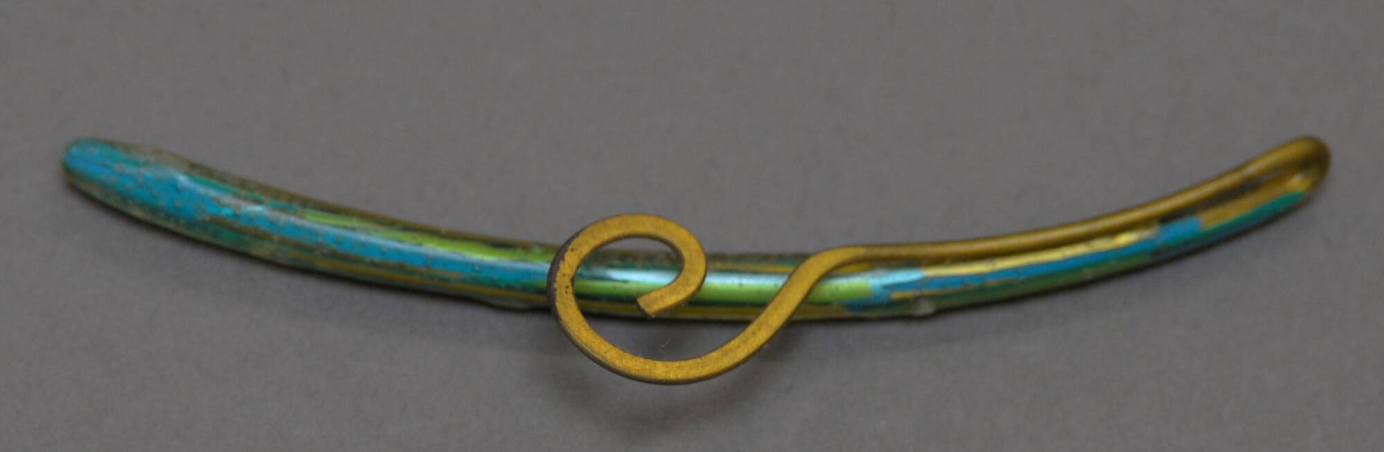 DescriptionA pin, one side a yellow spiral and the other a curve in blue and green.