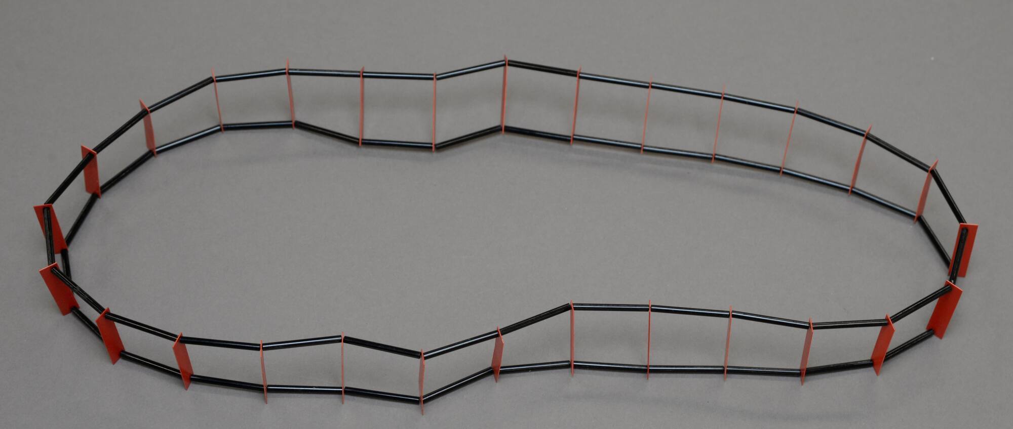 DescriptionTwo parallel black cords forming a circle with numerous red plastic strips attaches, resembling a ladder.