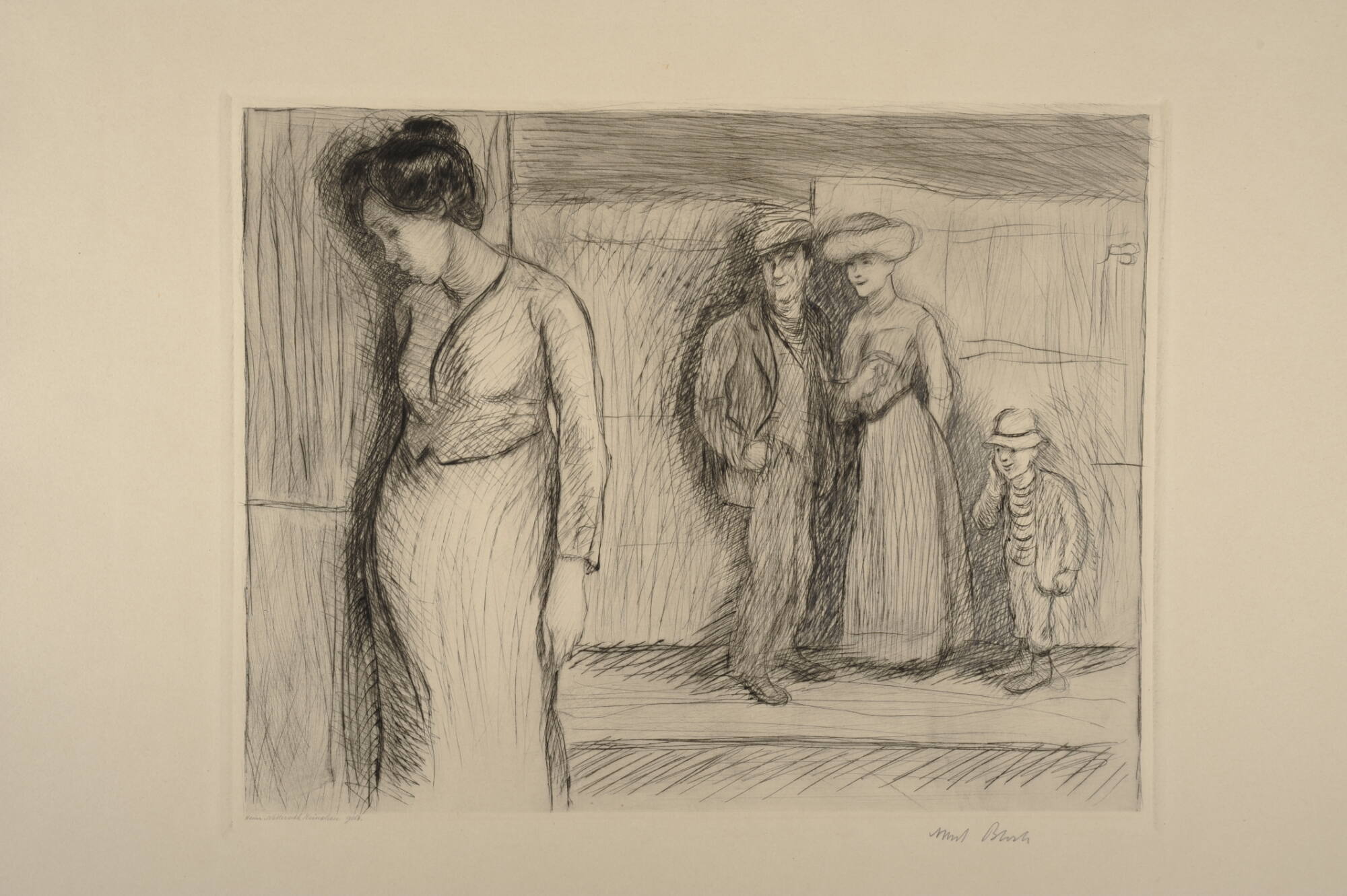 DescriptionUsing fine black lines, this horizontally oriented drypoint print portrays four figures. Near the left side of the composition positioned in a three-quarters pose and facing towards the left, is a dark-haired, pregnant woman. She wears a long-sleeved jacket or blouse that ends just about her swollen belly, and a long skirt or dress. Her proper left arm hangs limply by her side as she leans the proper right side of her body against what appears to be a wall. He figure casts a slight shadow on the wall. Her head is bowed and her eyes are downcast or closed. Across what appears to be a street, behind and to the right of the pregnant woman, stands a male/female couple and a small boy. The man is closest to the center of the composition. He wears a dark jacket and pants with a vest and a soft cap atop his head. He looks towards the pregnant woman on the opposite side of the street and wears a smug expression on his face. A slight smile plays at his lips. His proper right hand is in his pants’ pocket, while his proper left hand is extended as if gesturing to get the attention of the woman standing close by his side. She wears a large light-colored hat and a long, stripped dress with a cinched waist. Just to her right, near the right edge of the image, stands a little boy in short pants, jacket, a horizontally striped shirt, and a hat with a dark band above its brim. Like the man and woman with whom he stands, he looks towards the pregnant woman. His eyes wide, he smiles and raises his proper right hand to his cheek.Exhibition HistoryNone