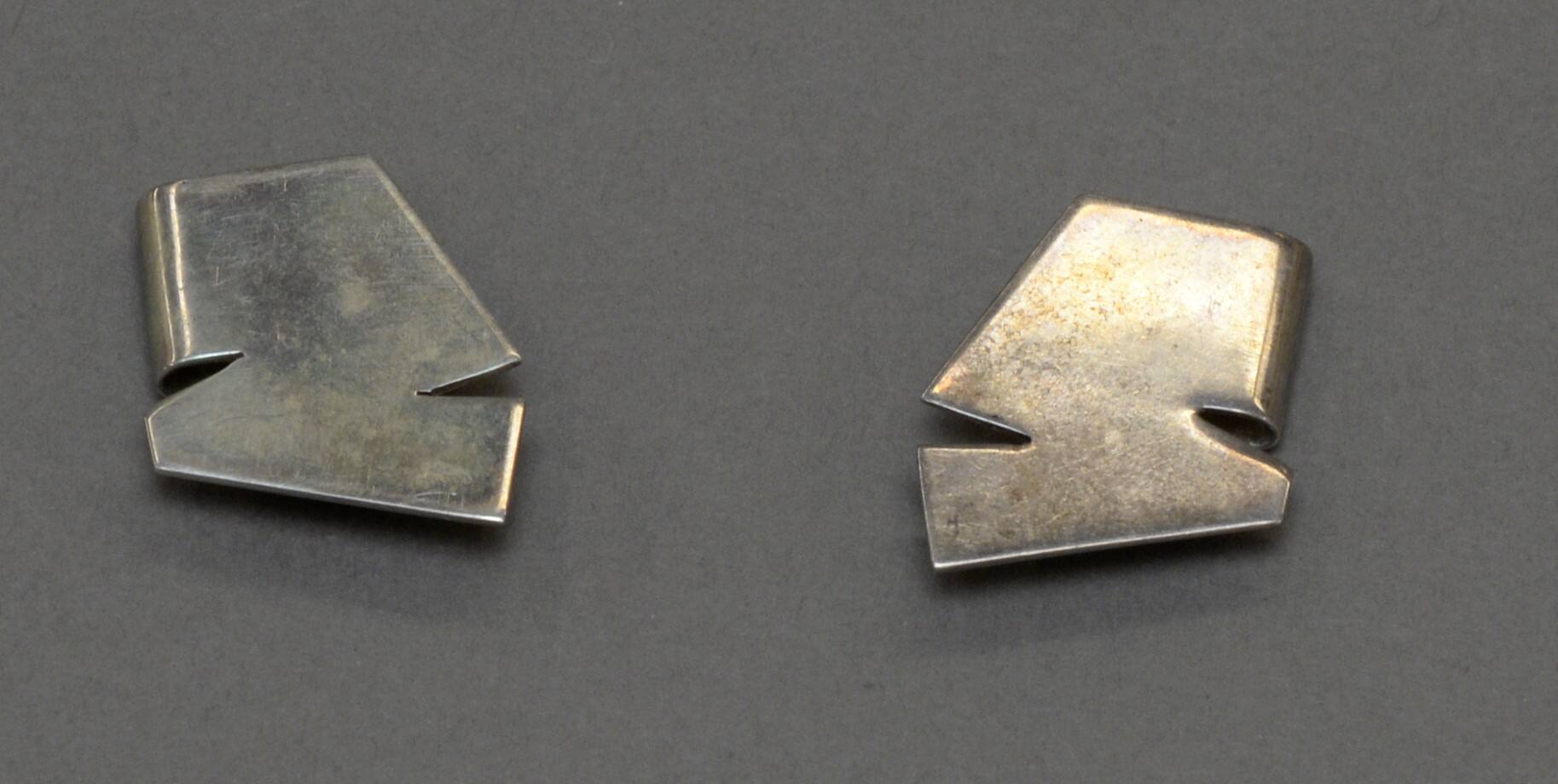 DescriptionA pair of silver gemoetric ear cuffs in a zig-zag formation.Copyright© Estate of Marjorie Schick