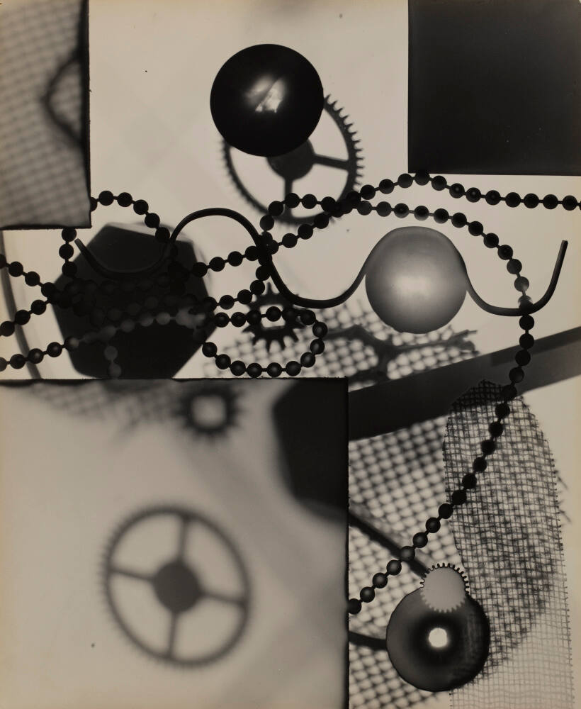 DescriptionPhotogram image composed of strands of beads, circular objects with overlapping squares and interlocking gears, and gridded strips of semi-transparent fabric.Exhibition HistoryRotation 26. The Nelson-Atkins Museum of Art, Kansas City, MO, March 29, 2019- August 25, 2019, no cat.