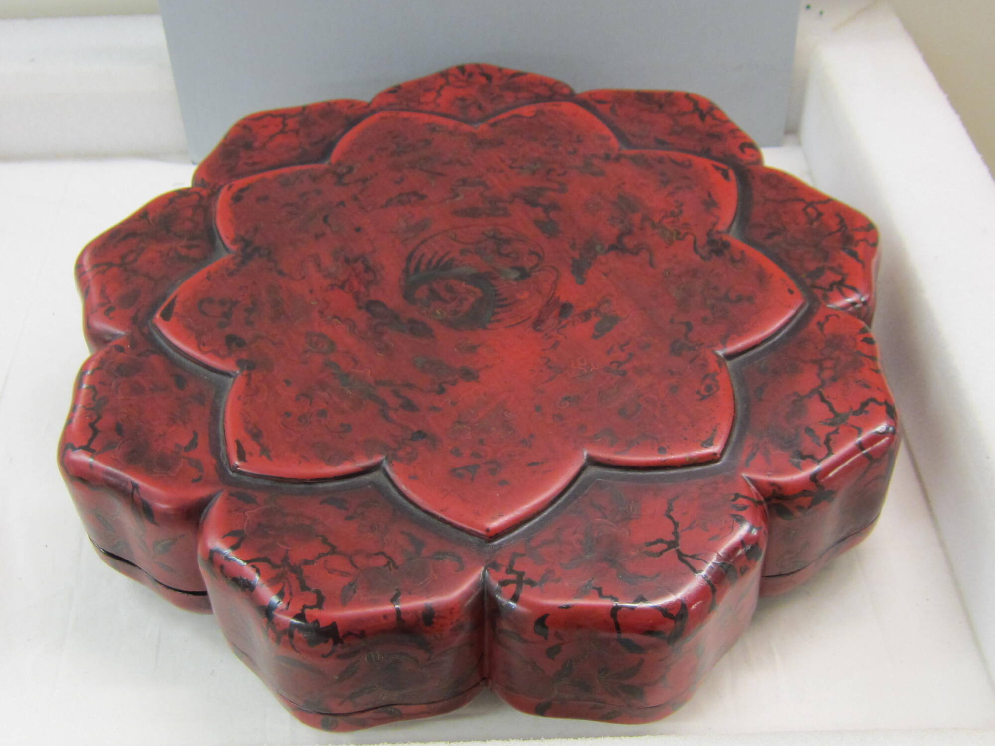 DescriptionNine-lobed circular box with smaller raised lobes on top. All-over design of peaches and clouds with phoenix bird in center; three cloud-shaped legs. Inside: brown lacquer with gold motif of peach, butterfly, and flowers. Inside trays: beige ground with peach and butterfly in red, orange, green, and brown.