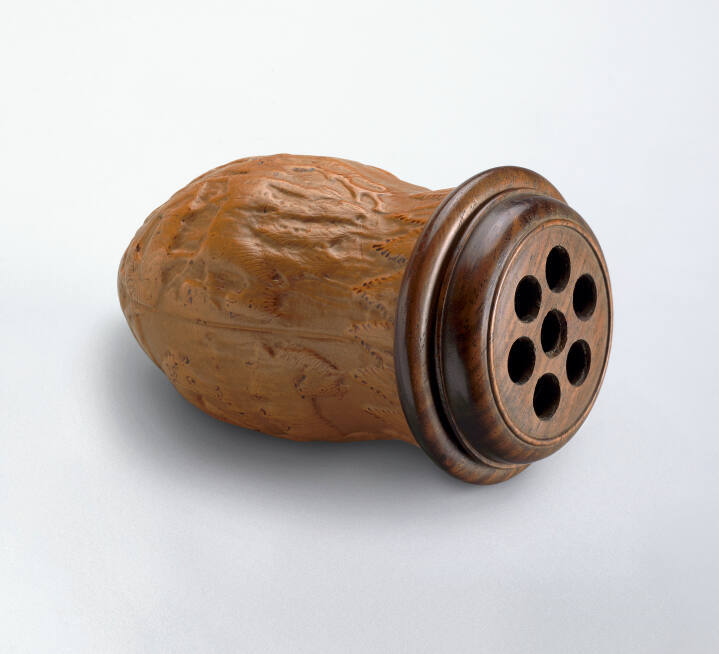 DescriptionSecondary molded gourd with heat engraving, wood fitting and lid.ProvenanceFanny Pomeroy Brown;