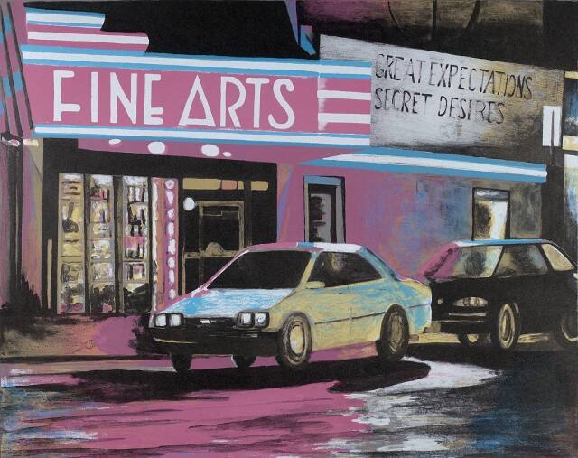 DescriptionOn dark gray paper, night view of cinema with light gray letters FINE ARTS on marqyee with red background, double blue and white border top and bottom. On side of marquee, right, in black letters, GREAT EXPECTATIONS/SECRET DESIRES on light gray ground. Segmented show window and entrance, left. Two automobiles--first blue, second black--facing left at curb. Red and white reflections in street, foreground.Copyright© Jane Pronko