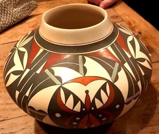 DescriptionJar painted with black, red, white, and orange colored abstract designs on a cream-colored body with four stylized butterflies around the surface.ProvenanceHugh Zimmer, Kansas City, MO;