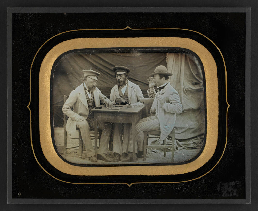 DescriptionImage of three men seated around a small wooden table where they play dominoes. They are all wearing suits with hats. The man on the right is wearing checkered pants and his hands are raised. The bearded man on the left smiles as he lays down his domino. This half plate uncased daguerreotype is housed in a raised passé-partout enclosure with reverse painted cover glass and dark green paper backing.Gallery LabelBy the mid-1850s, photographic exposure times were less than a minute, but sitters were still required to sit for several seconds, making spontaneous poses difficult. Nonetheless, photographers like this one strove to imitate candid moments of everyday life. The photographer poses the three men as naturalistically as possible. The man on the right raises his hands in surprise or indignation, reacting to his opponent’s play as the third player looks on.