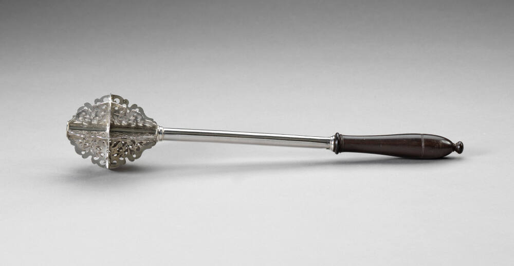 DescriptionSilver rod with a turned wood handle leading to a tapered stem. The head of the silver rod has six pierced panels with a disc intersecting the panels at the mid-point.ProvenancePurchased from S.J. Shrubsole by the Nelson-Atkins Musuem of Art, Kansas City, Missouri, 2018