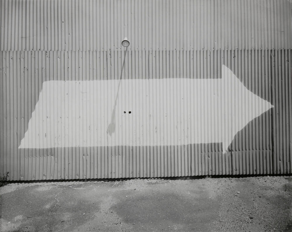 DescriptionImage of an arrow painted on the side of a corrugated metal wall with a flood light above.ProvenanceThe Hall Family Foundation, Kansas City, MO, 2018;