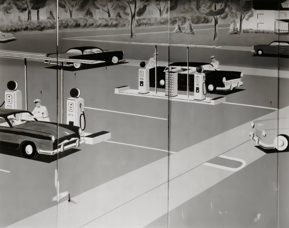 DescriptionImage of a painting depicting a gas station with uniformed attendants cleaning windows of cars as they refuel.Gallery LabelDow photographed this painting at a gas station in Georgia. Several attendants in crisp, white uniforms pump gas and wipe windshields in a clean, well-organized outdoor setting.