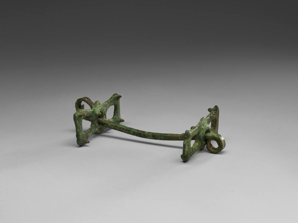 DescriptionThe horsebit is composed of two identical cheekpieces and a bar joining them. Each cheekpiece is rectangular with a design in open-work composed of an X whose ends join the corners.
