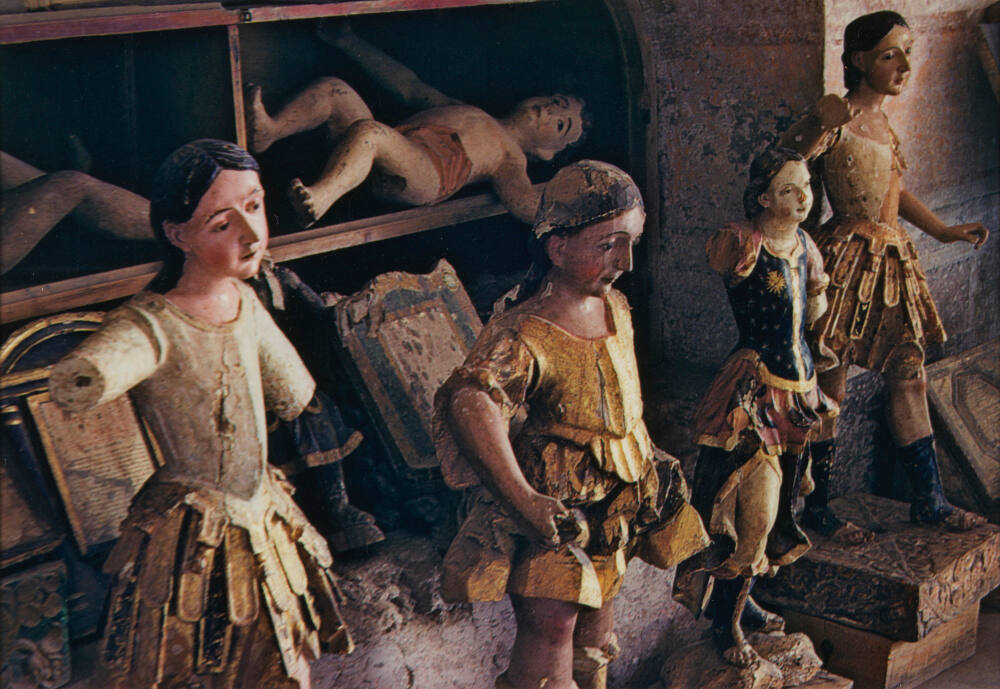 DescriptionImage of carved wooden figures painted and standing on small platforms; some arms are missing. Carved wooden babies are resting on their backs in the cubbies behind.ProvenanceDr. Jack and Judy Stern, Rye, NY;