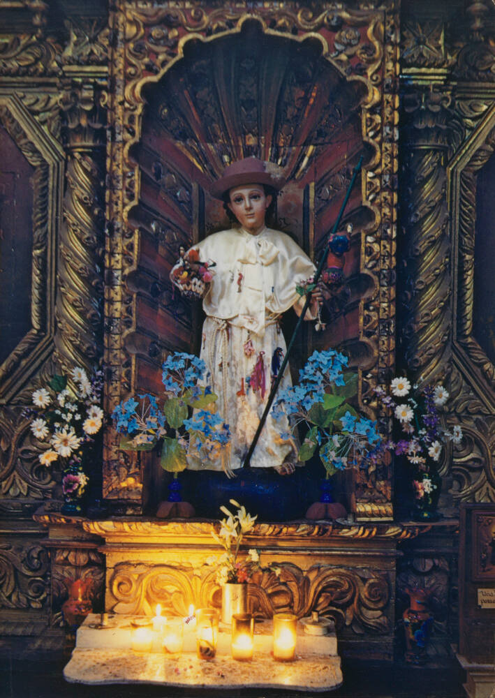 DescriptionImage of a figure wearing a burgundy hat and white satin garment inside of an intricately carved alter with flowers and candles.ProvenanceDr. Jack and Judy Stern, Rye, NY;