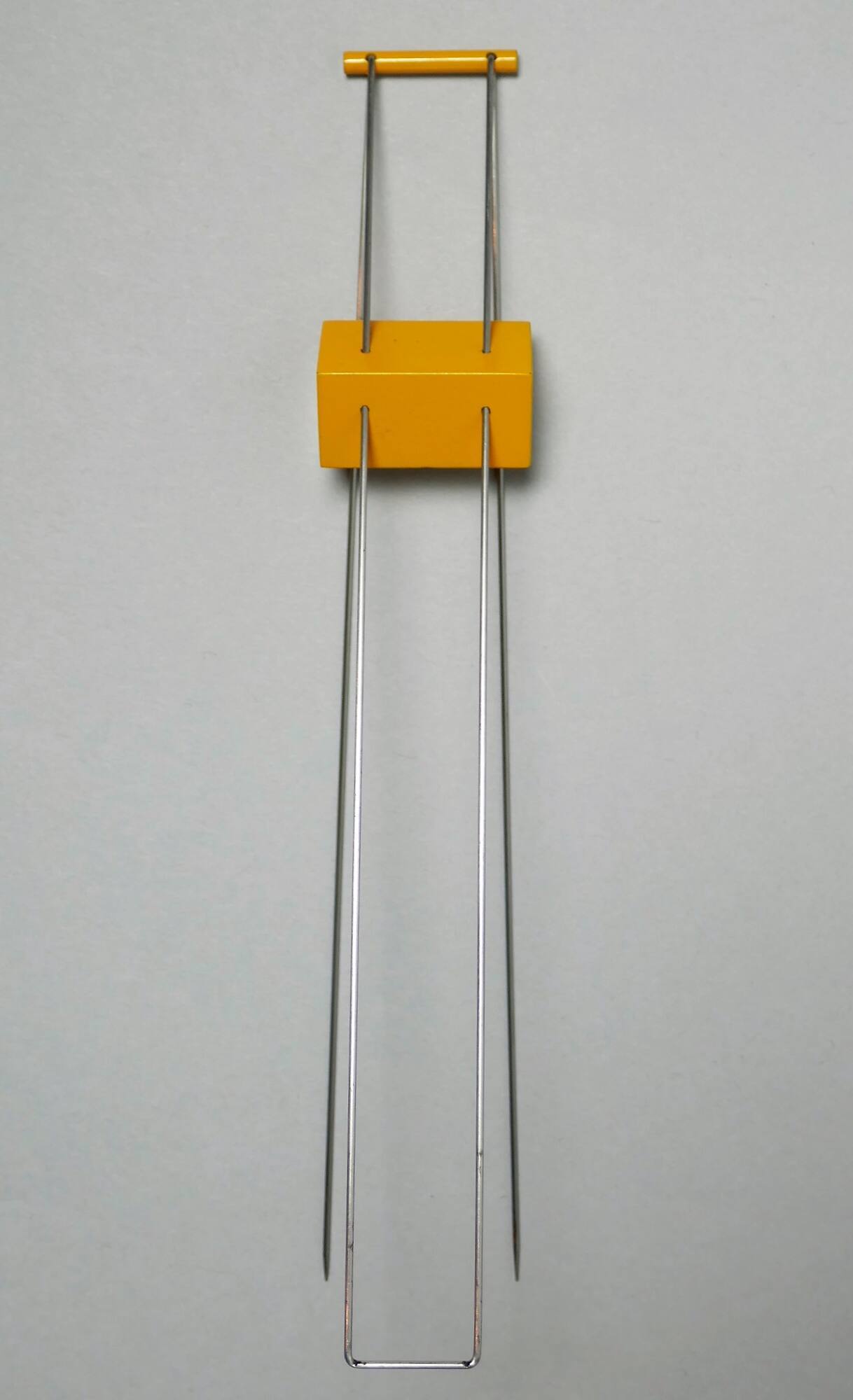 DescriptionA silver metal wire bent in an A-frame shape with one side open and the other side folded. A thin yellow rod sits at the top bend and a yellow isosceles triangular prism is pierced through the folded side.ProvenanceMarjorie Schick (1941 2017), Pittsburg, KS;