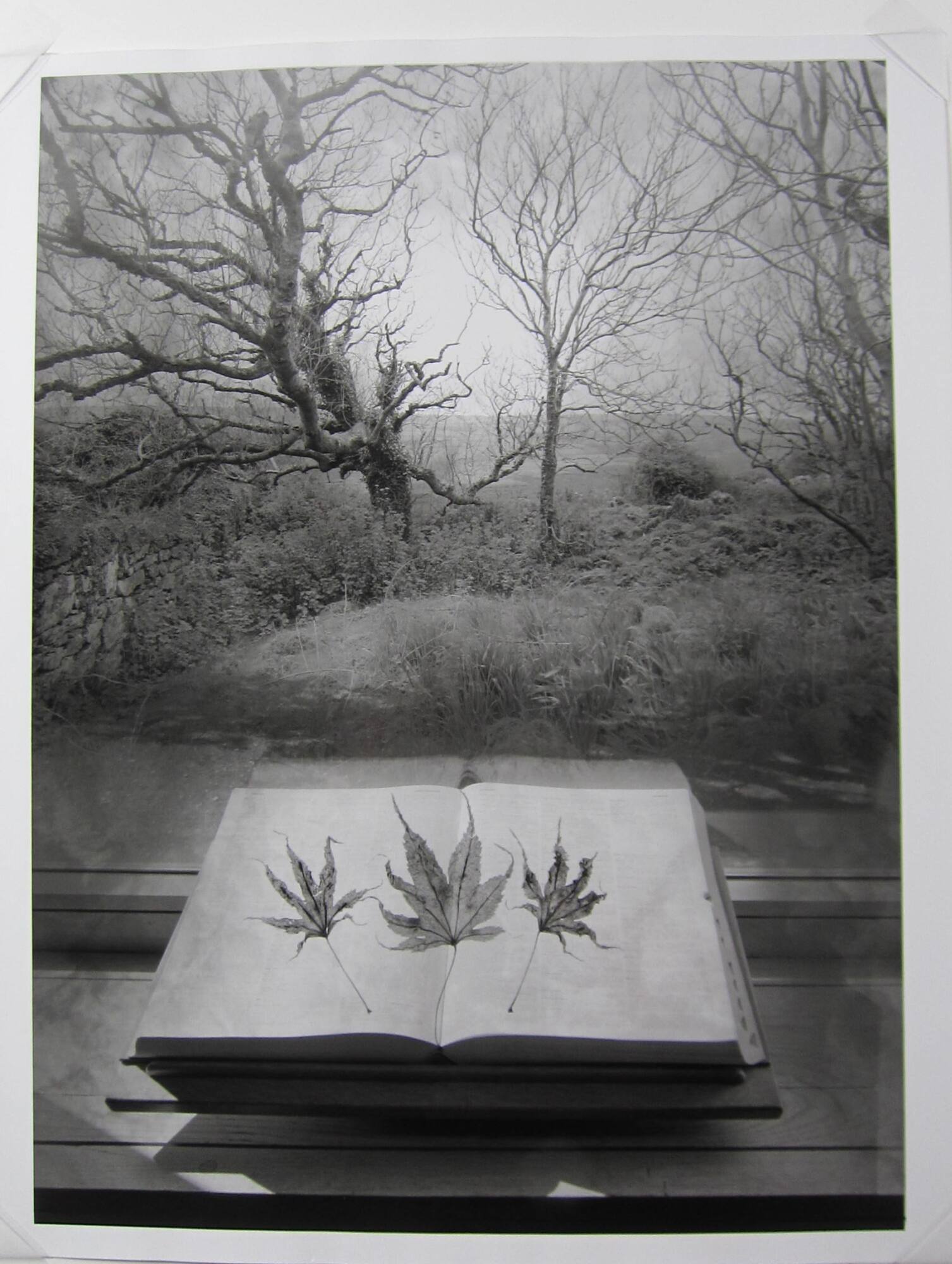 DescriptionImage of an open book with three leaves displayed in the center; the book is placed on a wooden stand in front of a window that looks out onto a landscape of tall grasses and trees with gnarled branches.ProvenanceJerry Uelsmann, Gainesville, FL;