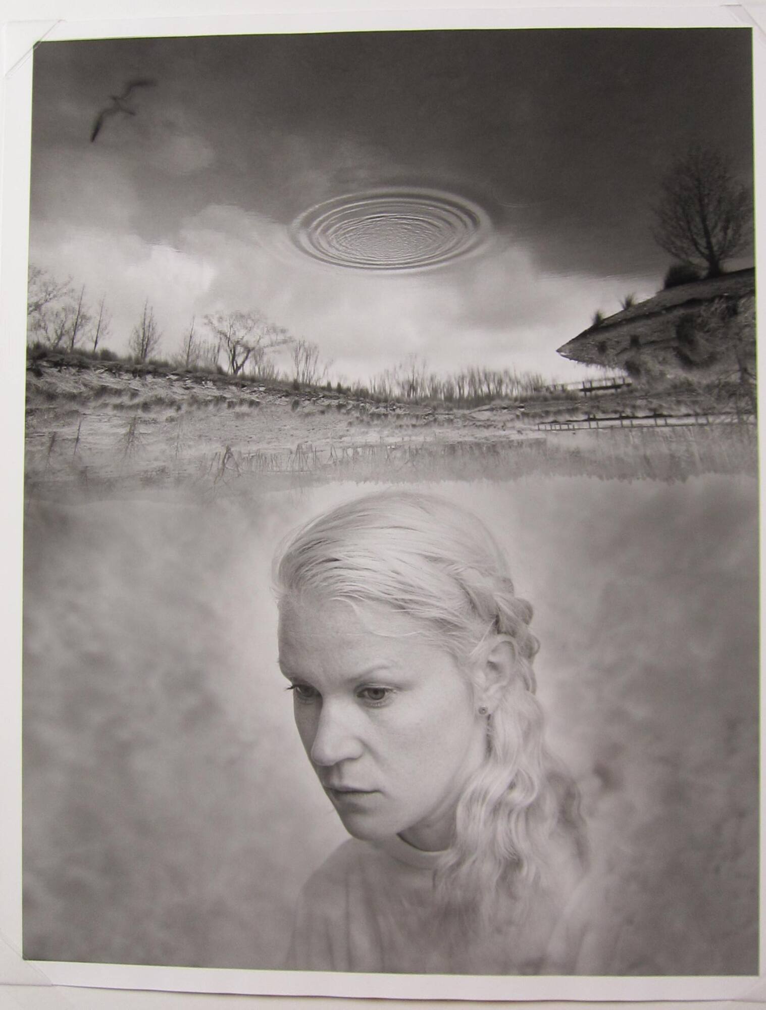 DescriptionImage of woman in three-quarter profile with loosely braided hair. Above her is a ripple of water surrounded by clouds and a tree-lined landscape which is reflected in the still water below.ProvenanceJerry Uelsmann, Gainesville, FL;