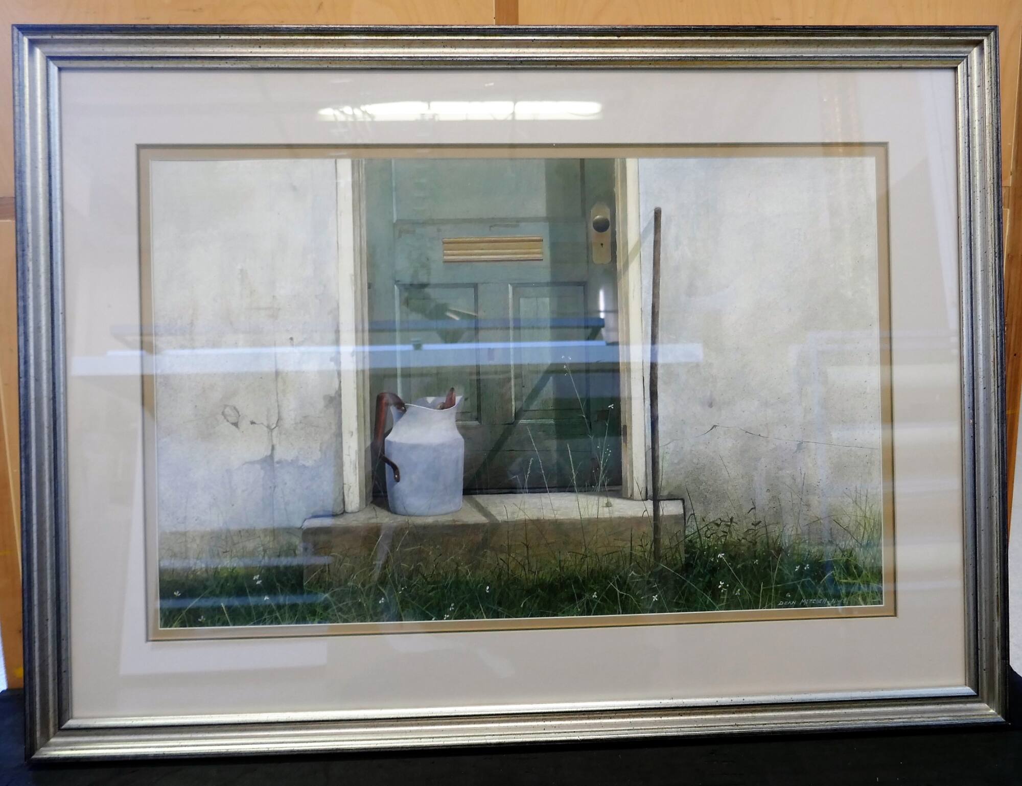 Dean Mitchell explains the many complex techniques with which he experimented to create a deceptively simple composition: "The initial stage of the painting began with a very light, loose, precise gesture drawing to place forms. It began with washes of watercolor from light to medium tones to define space and light. Acrylic paints with various light opaque washes added weight to the door and pitcher. The pitcher itself was done by scumbling (applying) subtle, heavy blue-grey opaque washes. I chose a long, thin, fine hair liner brush for the grass area with various light greens in acrylic. I used matte medium mixed with transparent watercolor as a glaze to add a richness to the door and grass area. The shadows on the door and step are light glazes as well. The concrete wall has small amounts of splattering with an old toothbrush to add texture to the wall. There's possibly some small cross-hatching brushwork in it as well; I was experimenting quite a bit with drybrush watercolor in the early to mid 1980s."