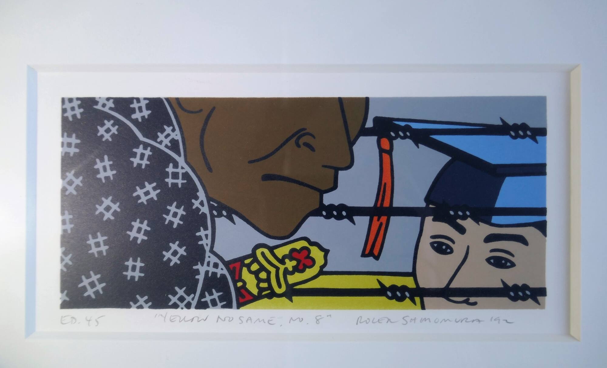 DescriptionA boy wearing a mortarboard hat at right, behind barbed wire, looks left toward traditional male Japanese figure who faces right. Cropped to show the upper half of the boy's face and the lower half of the Japanese figure's face. The background is mostly a light gray-blue with a band of yellow at bottom edge.Exhibition HistoryProvenance