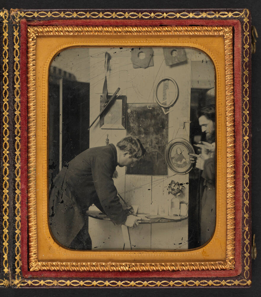 DescriptionImage of man in profile wearing a long jacket leaning over table with brush in hand. Another man stands at the right edge of the frame and looks on. There is a small vase filled with flowers and papers scattered on the table. On the wall above hang frames and supplies. This sixth plate ambrotype is housed in a brass mat inside of case with a red velvet embossed liner.Provenance