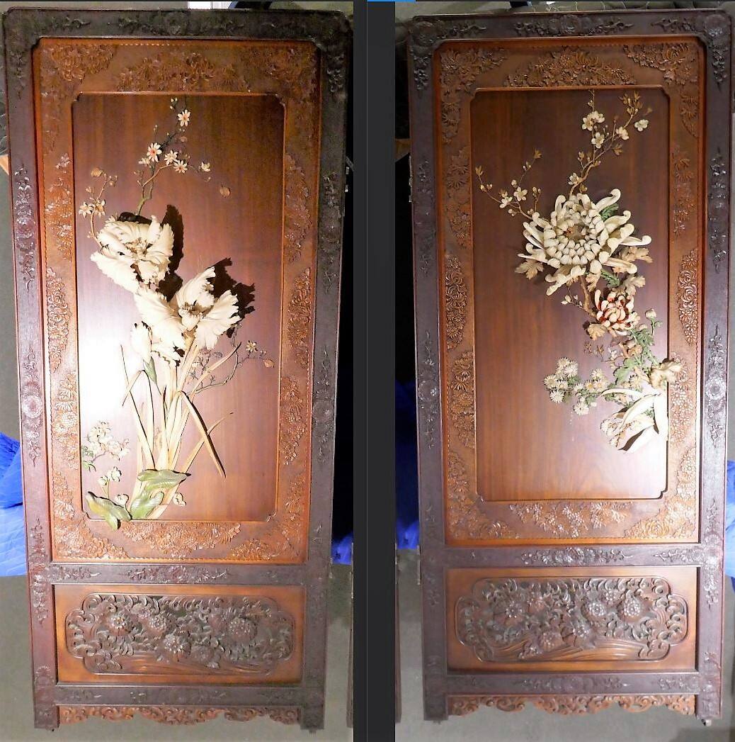 DescriptionThe lacquered wooden two-panel screen is decorated with ivory, bone, and shell inlays of bird-and-flower motifs on the front and back. The panels are connected with metal hinges, and there are wheels on the feet. The upper three-quarters of the front panels is decorated with flowers and insects. On the left panel are carved ivory iris blossoms in high relief, while on the right panel are carved ivory chrysanthemum blossoms. Falling cherry blossoms in inlaid ornament are found on the backs of the panels. The ivory motifs, the other smaller flower motifs made of dyed bone, and bird and insect motifs are executed in the Shibayama inlay technique into the lacquered surface. The borders of the panels are further decorated with intricate wooden carvings of chrysanthemum flowers. The outer border is stained in a darker brown. The bottom quarter of the front of the panels are decorated separately with carved wooden motifs such as wave and chrysanthemum.