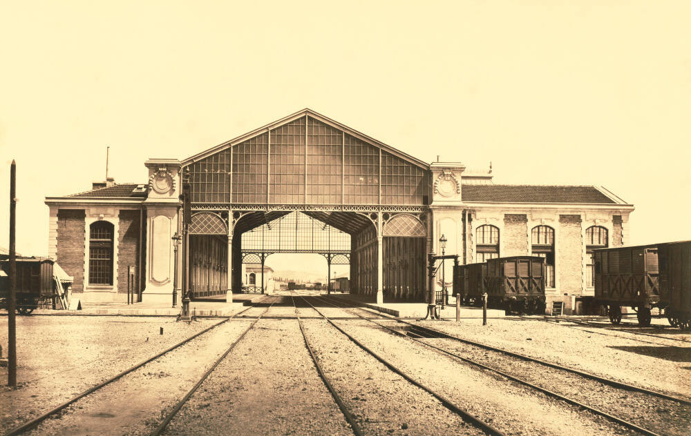 DescriptionImage of railway station with train tracks crossing under a covered platform. Arched doorways and wall sconces line both sides of the platform. Rail cars are parked near left and right edges of the frame.Gallery LabelÉdouard-Denis Baldus photographed the train station in Toulon while on commission for the Paris-Lyon-Méditerranée (PLM) railroad. Baldus places his subject in the center, using the slender train tracks to lead the viewer’s eye to the station. To make this print Baldus used a glass negative, which provided greater detail and clarity than paper negatives. This bold, simple composition devoid of extraneous detail was well suited to Baldus’s modern architectural subject.