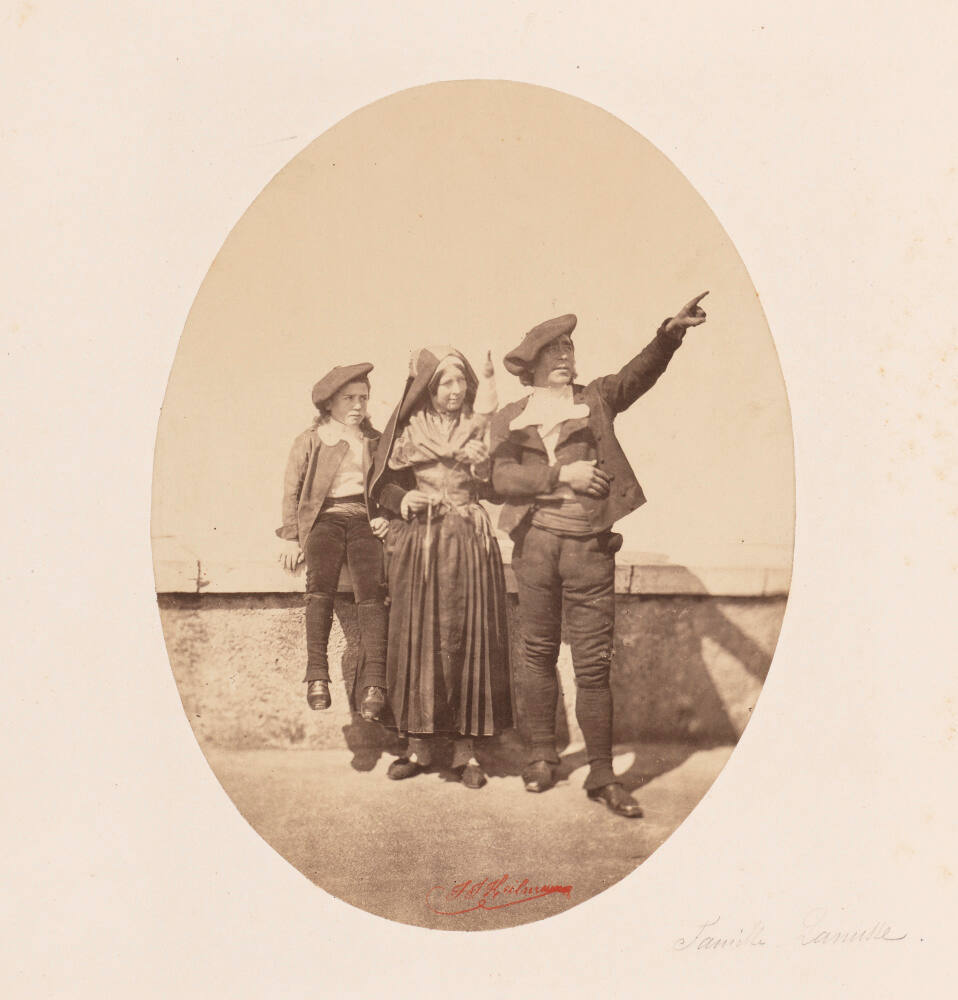 DescriptionAn oval image of man, woman, and young boy near a ledge. They all look up towards where the man is pointing with his left hand. The boy and man are similarly dressed in jackets with large collars and berets. The woman is wearing a long dress and her head is covered; she holds a spinner wound with fibers in her left hand.ProvenanceThe Hall Family Foundation, Kansas City, MO, 2019;