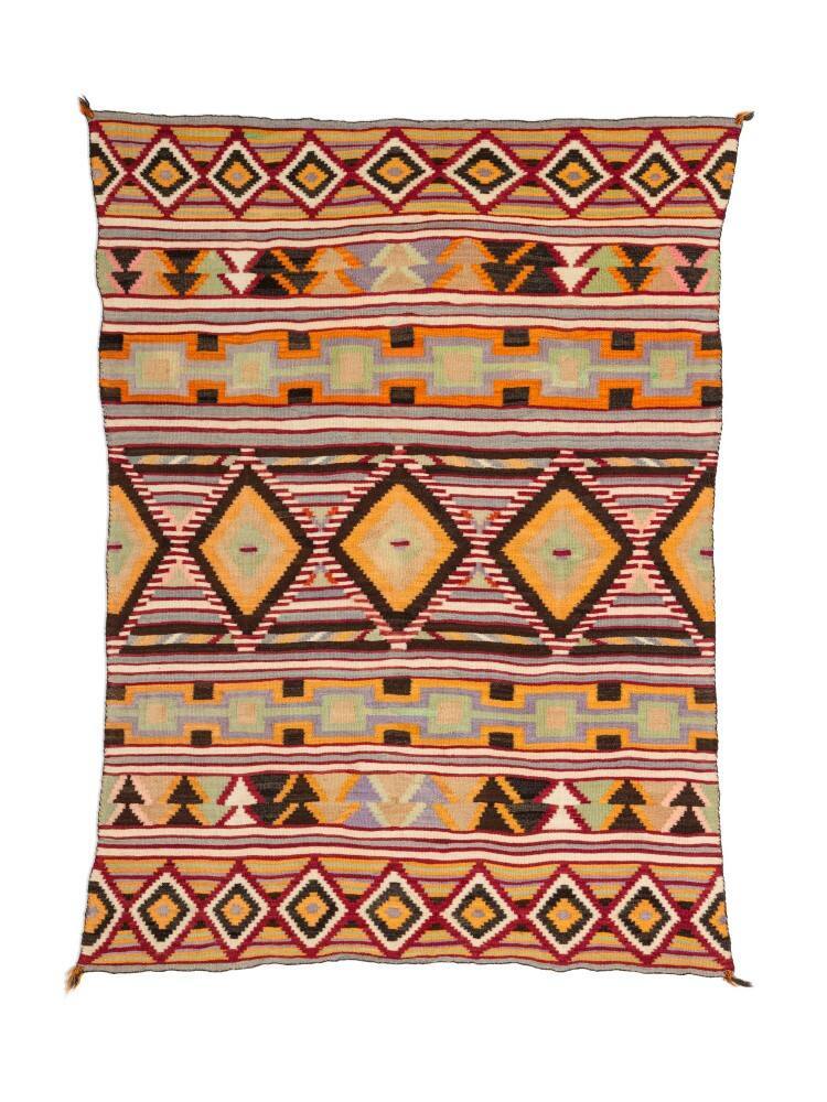 DescriptionWoven serape in brown, white and other pastel-colored yarns consisting of striped, terraced diamonds, and other geometric designs.Provenance