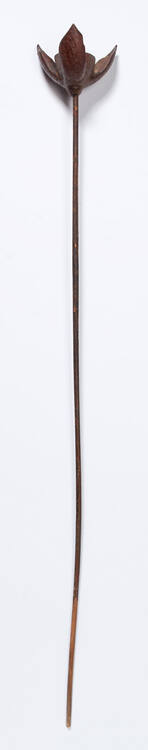 DescriptionHalf opened lotus flower, with a seed pod and three petals, on a straight stem, carved out of wood in a red-brown color.