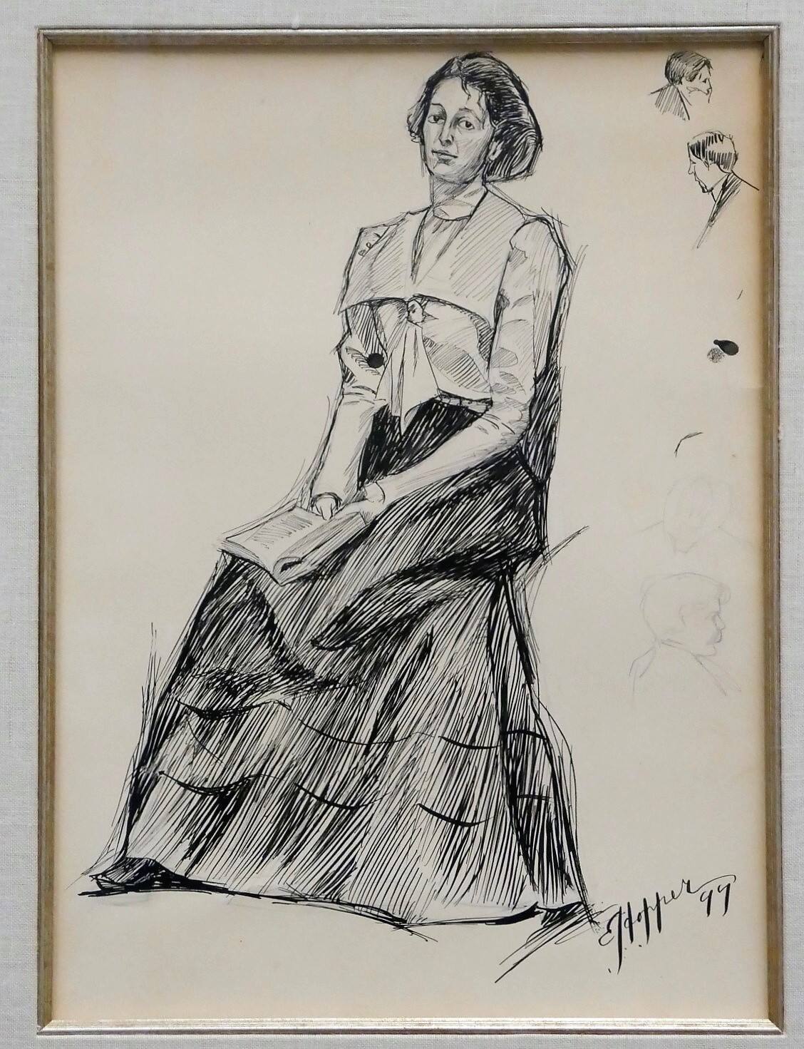 DescriptionThis is a vertically oriented drawing executed in black ink and gray graphite that depicts a young or middle-aged Caucasian woman. She is seated, but the support on which she sits is not depicted. Her body is in three-quarter view with her proper left side closest to the picture plane, but her face is turned further toward her proper left, looking directly at the picture plane. She is wearing an up-do for her hair; a long-sleeved, light-colored blouse with a broad collar that meets at her breast with a tie detail; and an ankle-length black skirt. One black shoe is visible under her skirt at the bottom left of the drawing. Her arms lay on her lap, bent slightly and holding an open book on her knees. There are four small sketches along the right-hand edge of the paper, two in ink at the upper right corner and two in graphite near the middle of the right edge. The uppermost ink sketch depicts a portion of the proper right profile of a man. The sketch just below the uppermost one depicts the proper left profile of a man similar to the man depicted in the first sketch. The upper of the two graphite sketches is unclear but may depict the top of the shoulders and head of a person wearing a Stetson-style hat. The lower graphite sketch depicts the proper right profile of a man who appears to have a moustache. There are also small ink lines and inkblots in the space along the right edge of the drawing between the two pairs of sketches. There is also a circular, black inkblot near the proper right elbow of the woman.Exhibition HistoryFurther research needed.