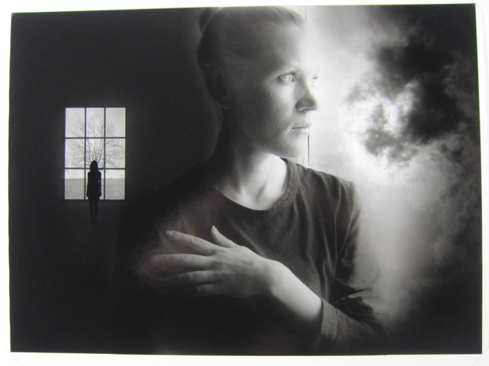 DescriptionImage of woman with left arm stretched across chest; light shines onto her face as she looks out towards a dark could. On the left, a silhouetted figure stands in the center of a 9-pane window, which frames a tree in the center of a flat landscape.ProvenanceJerry Uelsmann, Gainesville, FL;