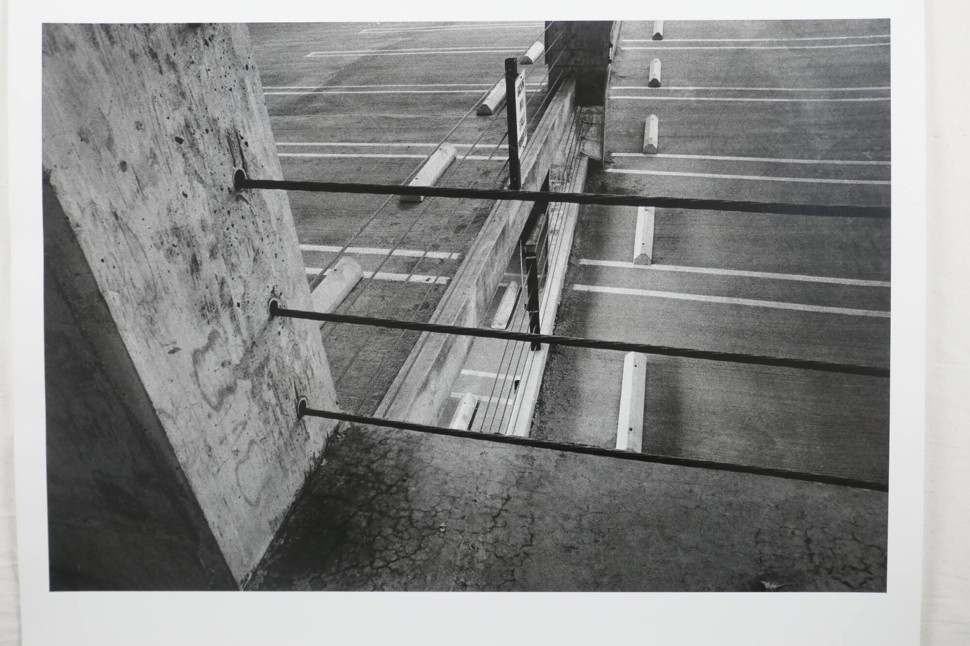 DescriptionImage taken from above looking down onto three levels of a parking garage. In the foreground are steel cable railings inserted into a stone column.ProvenanceWilliam Lyons, Kansas City, MO;