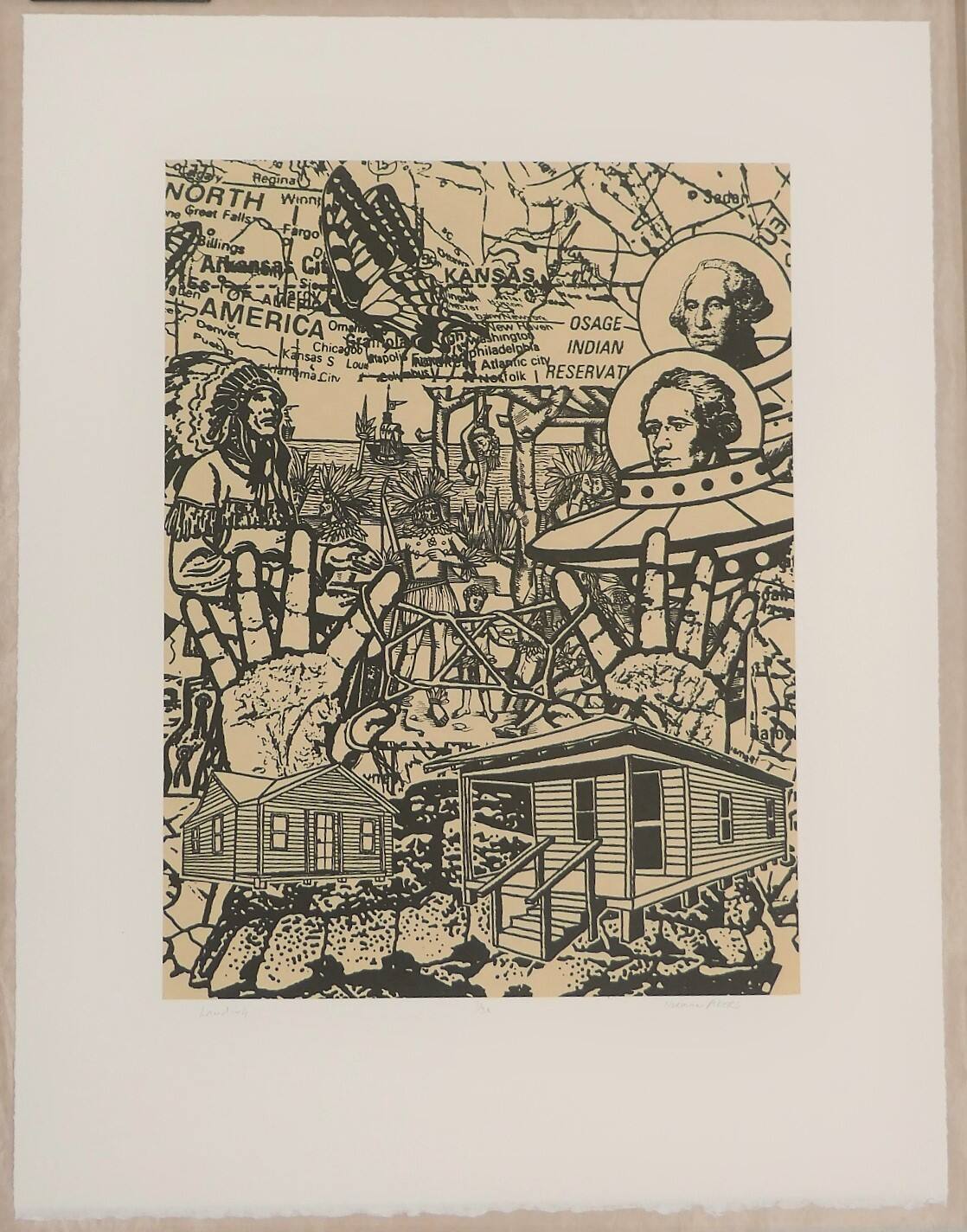 DescriptionThe Print Society's commissioned print by Norman Akers. This work is a continutation of his four-part "Uncontested Territories" print series created in 2014. Elements of landscape, a distorted map, iconic presidents in flying saucers, a stereotypical Indian in a Plains headdress, two human hands (forming a "cat's cradle" - a game played with string), and two buildings are used to evoke concepts of "the other," "the alien," and artificial borders.ProvenanceCommissioned purchase from the artist, Norman Akers by The Print Society, 2019.