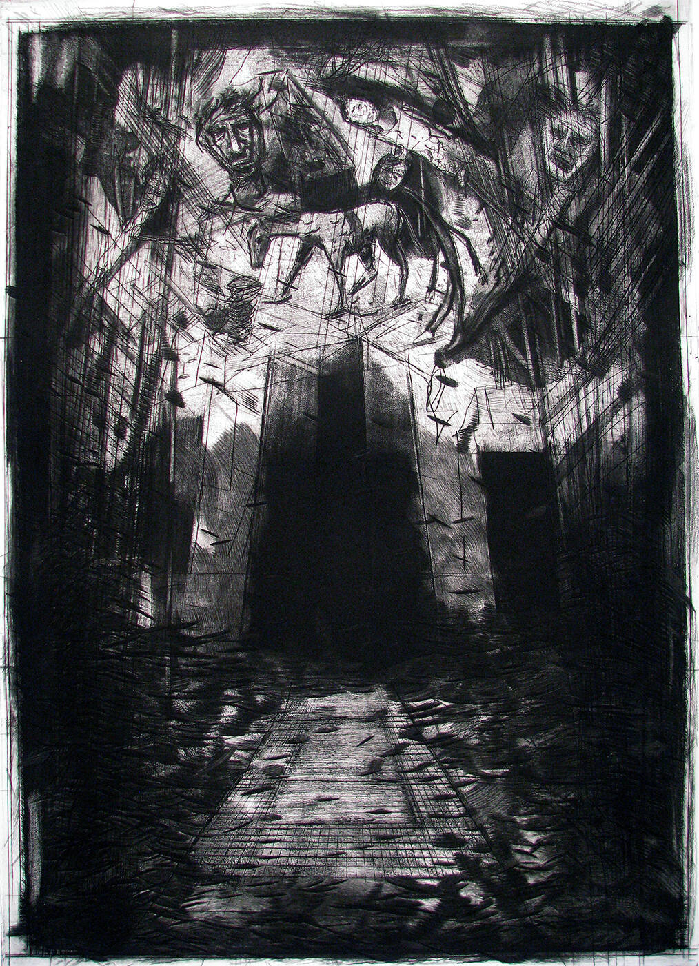 DescriptionThe focus of this vertically-oriented black and white print is a four-sided, tower-like structure that is darker at the bottom and gradually gets lighter towards the top. The tower stands along the vertical midline of the image, its bottom sits just below center. In the upper third of the composition above the tower-like structure, float animal forms and human faces. There is a rectangular area in the bottom third of the image forming something like a pathway toward the tower. It extends backward in perspective from its edge near the bottom. This pathway has a border decorated with a grid. The ground on either side of the pathway and below it is accented with thick black dashes that continue into the darker areas near the edges of the composition.ProvenanceThe artist, Kansas City, MO, 2012-September 30, 2020 [1];