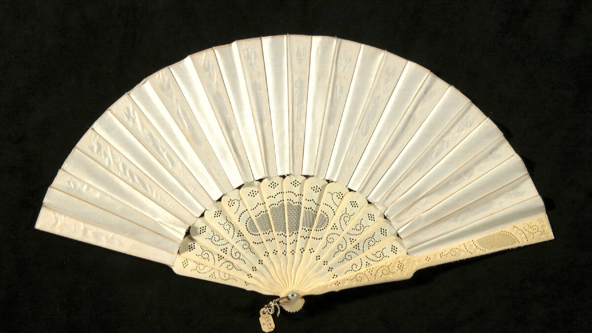 DescriptionElaborately cut ivory fan, semi-circular in shape, covered with shite silk. Silver shield on top with the initials "A.P.K."