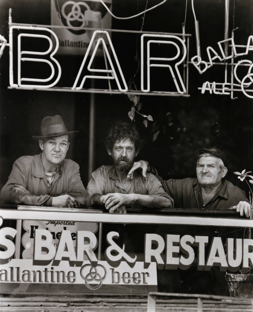 DescriptionImage of three men seated at a bar looking out the window. The man in the center has a beard. Neon signs hang above them.ProvenanceThe Hall Family Foundation, Kansas City, MO, 2020;