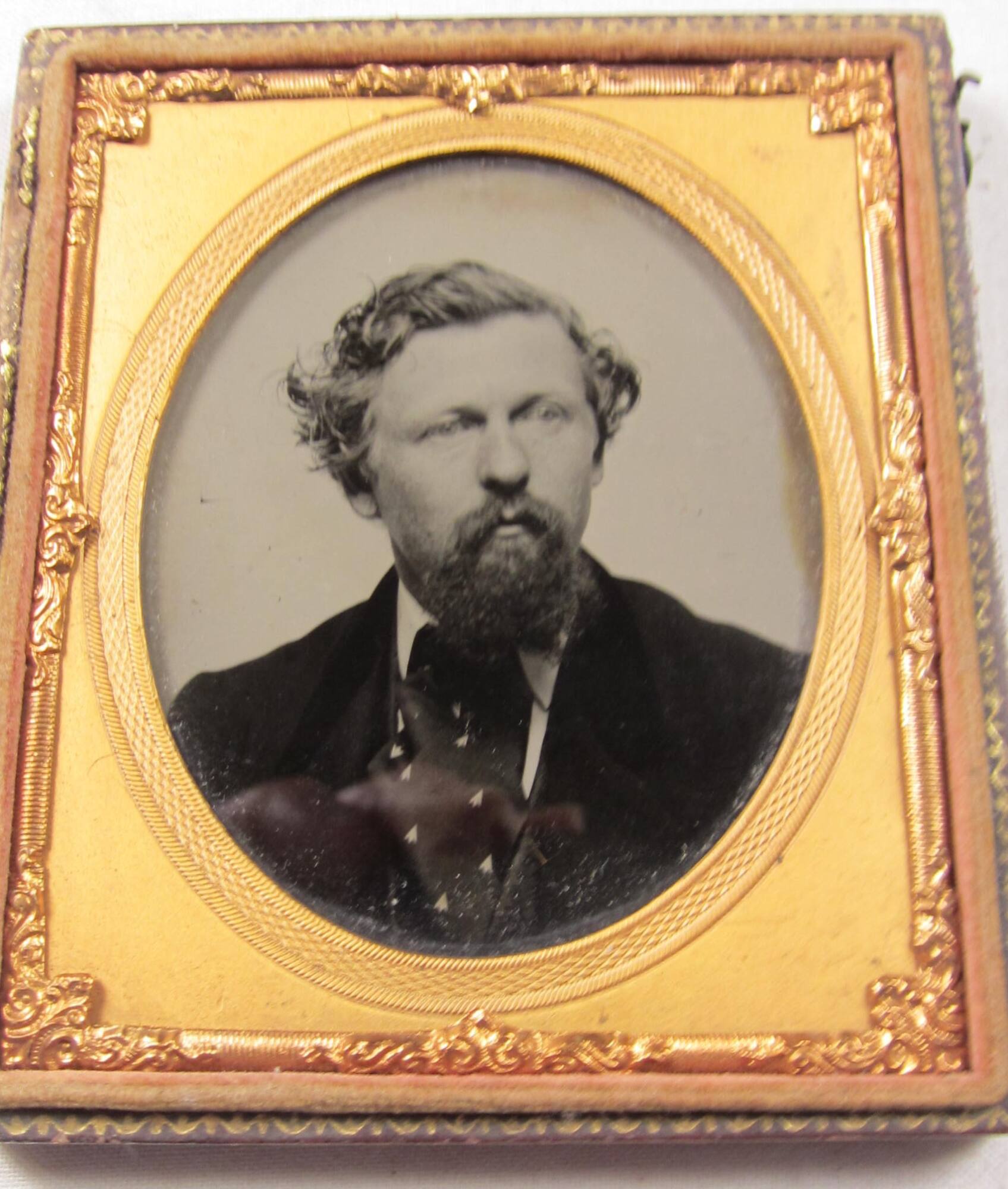 DescriptionImage of a bearded man wearing a collared shirt, jacket, and patterned tie. His curly hair is parted on the side and flips up near his ears.This sixth plate partially cased ambrotype is housed in an oval brass mat inside of the back tray of a brown case with gold tooling.ProvenanceHall Family Foundation, Kansas City, MO, 2020;