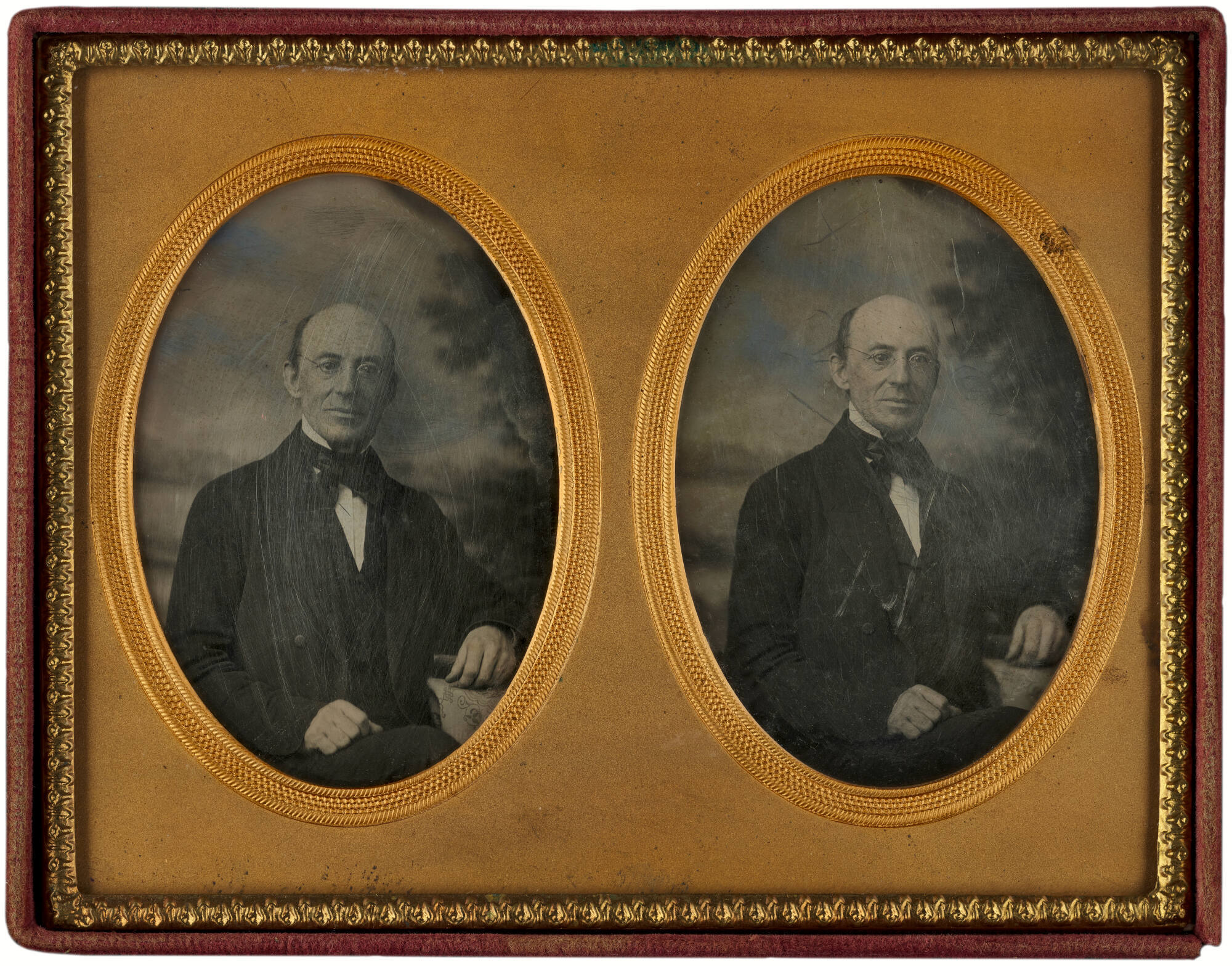 DescriptionImage(s) of a man seated with his arm resting on a book. He's wearing glasses and a dark suit with a vest and bow tie. He sits in front of a painted landscape backdrop. These two ninth plate daguerreotypes are housed in a single brass mat with oval openings inside of a case with a stereoviewer.ProvenanceEugene R. Groves Collection of 19th Century Photography;