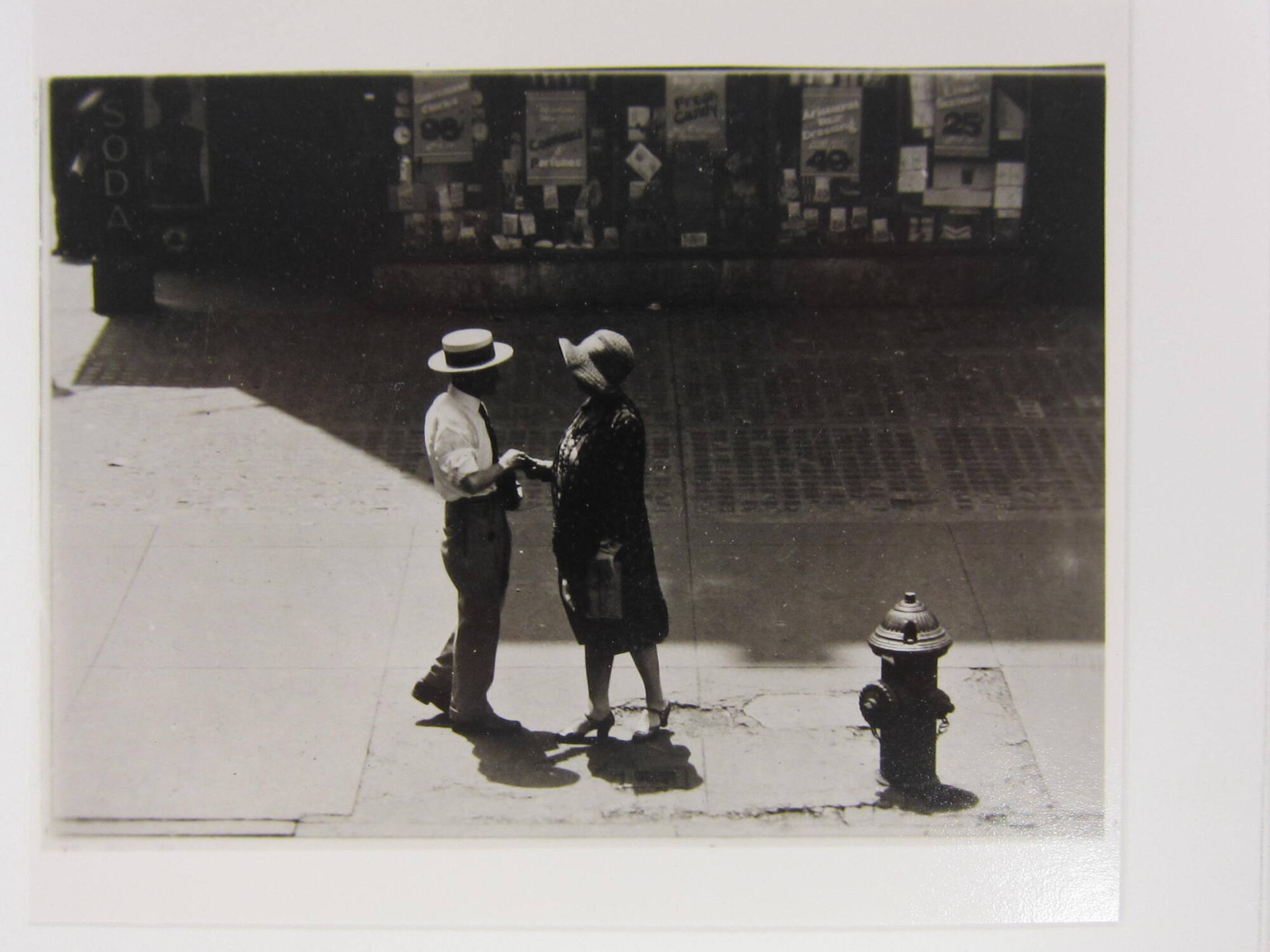 DescriptionImage of a man and a woman facing one another on a sidewalk outside of a storefront with a fire hydrant in the lower right corner. Each figure wears a hat and they reach out to hold hands.ProvenanceScott Nichols Gallery, San Francisco, CA;