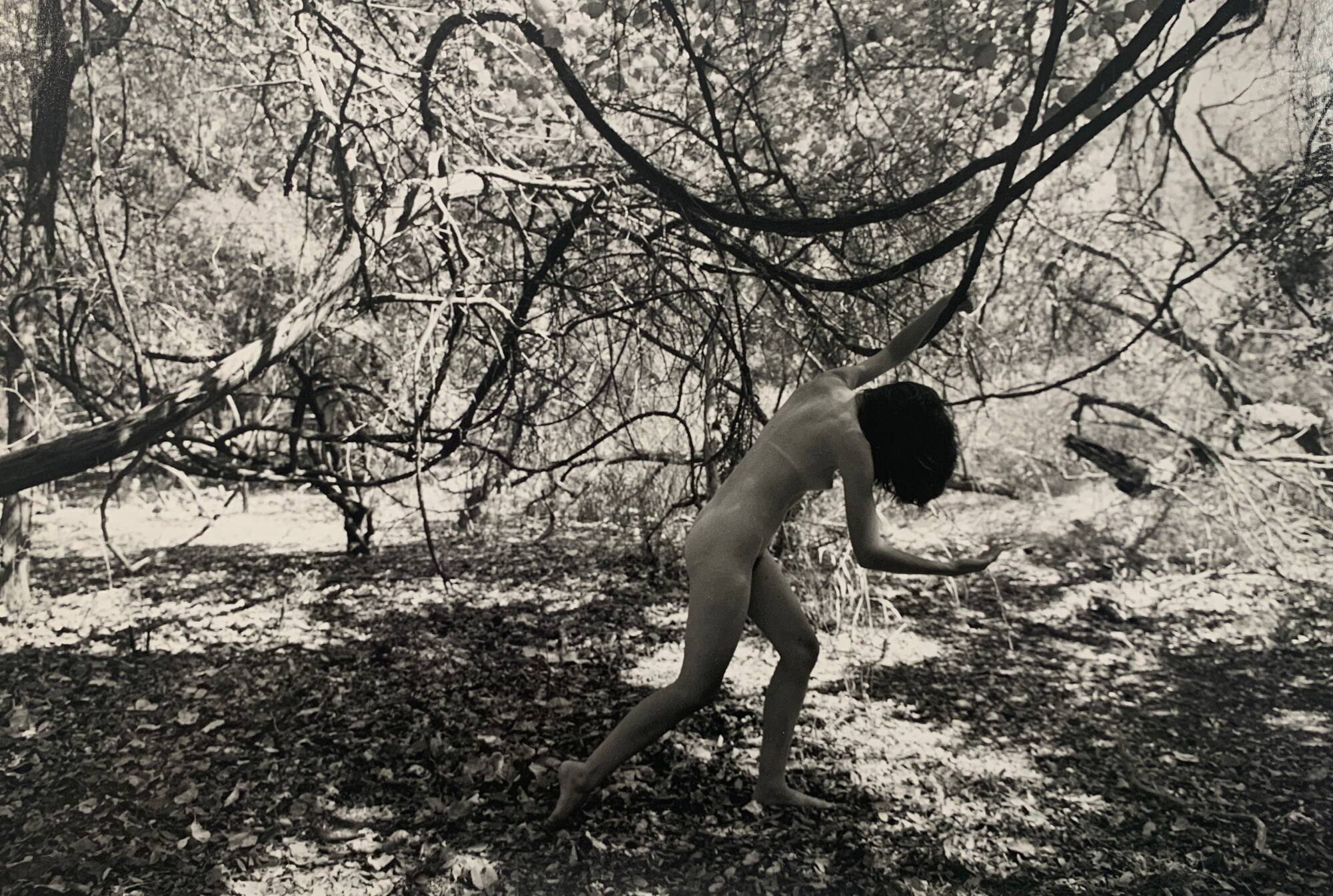 DescriptionImage of a nude woman standing in the center of the frame beneath intertwining tree branches. She stands in profile with her right leg stretched behind her and left arm raised to grab a branch. Her head is titled down so that her dark hair completely obscures her face. Dabbled light filters through the tree canopy onto the ground which is covered in leaves.ProvenanceLaura Aguilar Foundation, Los Angeles, CA;