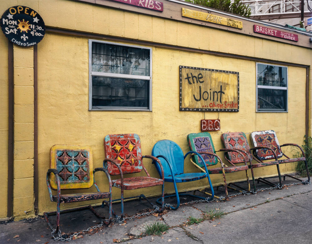 DescriptionImage of a row of brightly painted metal chairs lined up outside of a yellow building with two windows and a hand painted sign which reads: "the Joint...always Smoking' BBQ".ProvenanceJim Dow, Boston, MA, 2021;