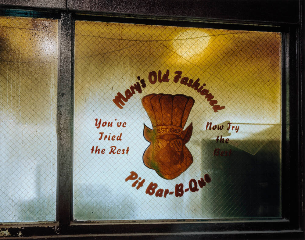 DescriptionImage of a window with a painting that depicts a pig wearing sunglasses and a chef's hat. Red cursive text around the image reads: "Mary's Old Fashioned Pit Bar-B-Que", "You've Tried the Rest Now Try the Best"ProvenanceJim Dow, Boston, MA, 2021;