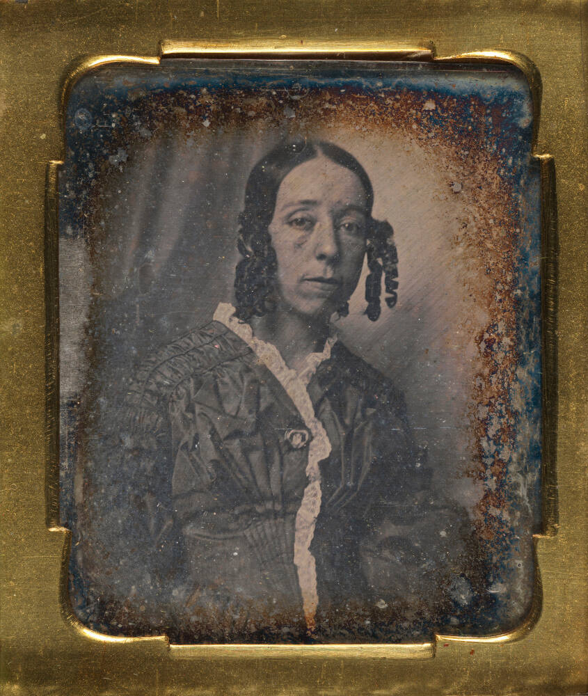 DescriptionImage of woman, Susan Fitz, with curled hair wearing a dress with decorative trim. This ninth plate cased daguerreotype is housed in a brass mat inside of a plain red leather side-opening case with a green silk liner.