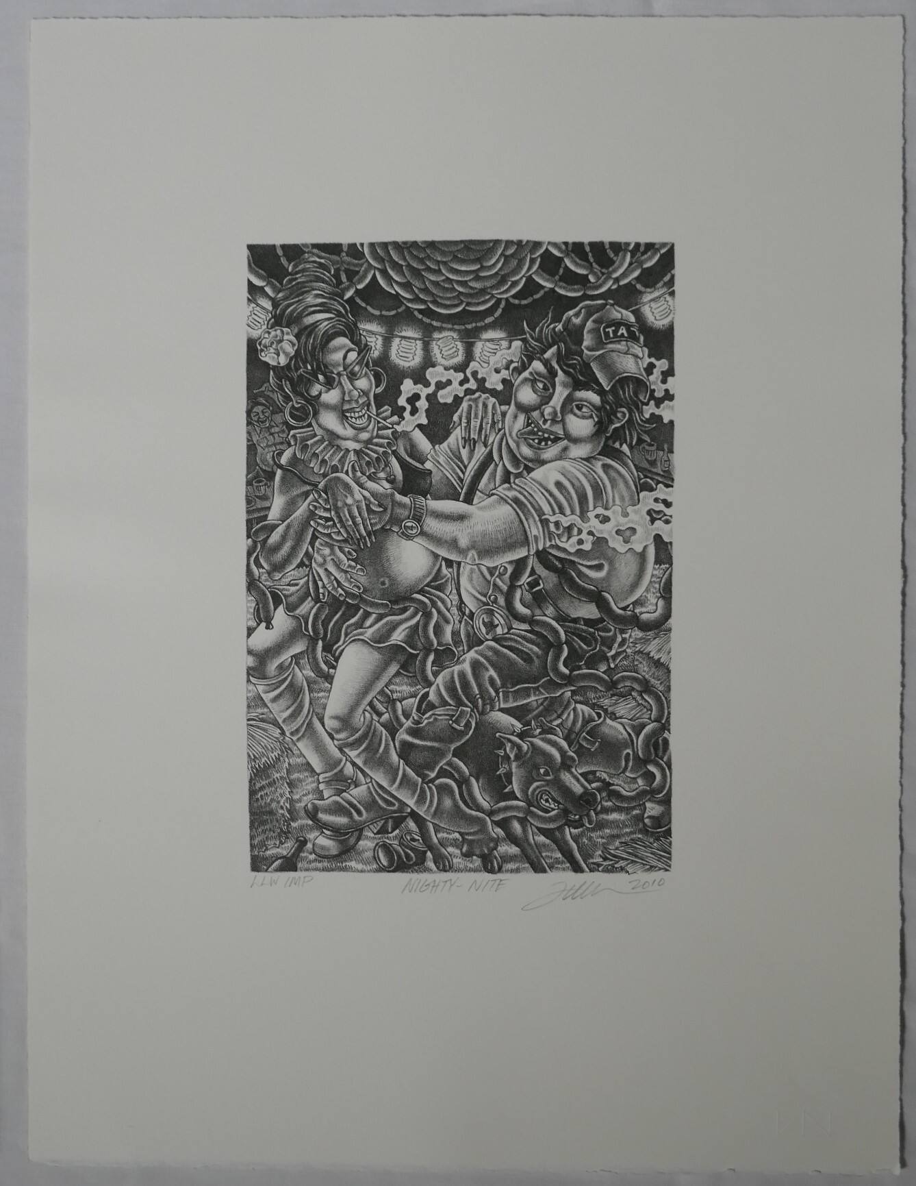 DescriptionBlack and white. Man seated at right, facing left, embraces woman at left, facing right. The room is hung with strings of frankfurters and Chinese lanterns. The man wears a sideways baseball hat with TA on the front, a tee shirt, and wrinkled trousers held up by suspenders. He has a string of hot dogs around him that his dog is munching on at his feet. She wears an enormous beehive hairdo, cat’s-eye glasses, hoop earrings, a ruff and a skirt. Stockings on her legs; a shoe on her proper right foot; her proper left leg, no shoe, rubs provocatively against his leg and the foot rests on the dog’s hind leg. She smokes a long cigarette.Provenance