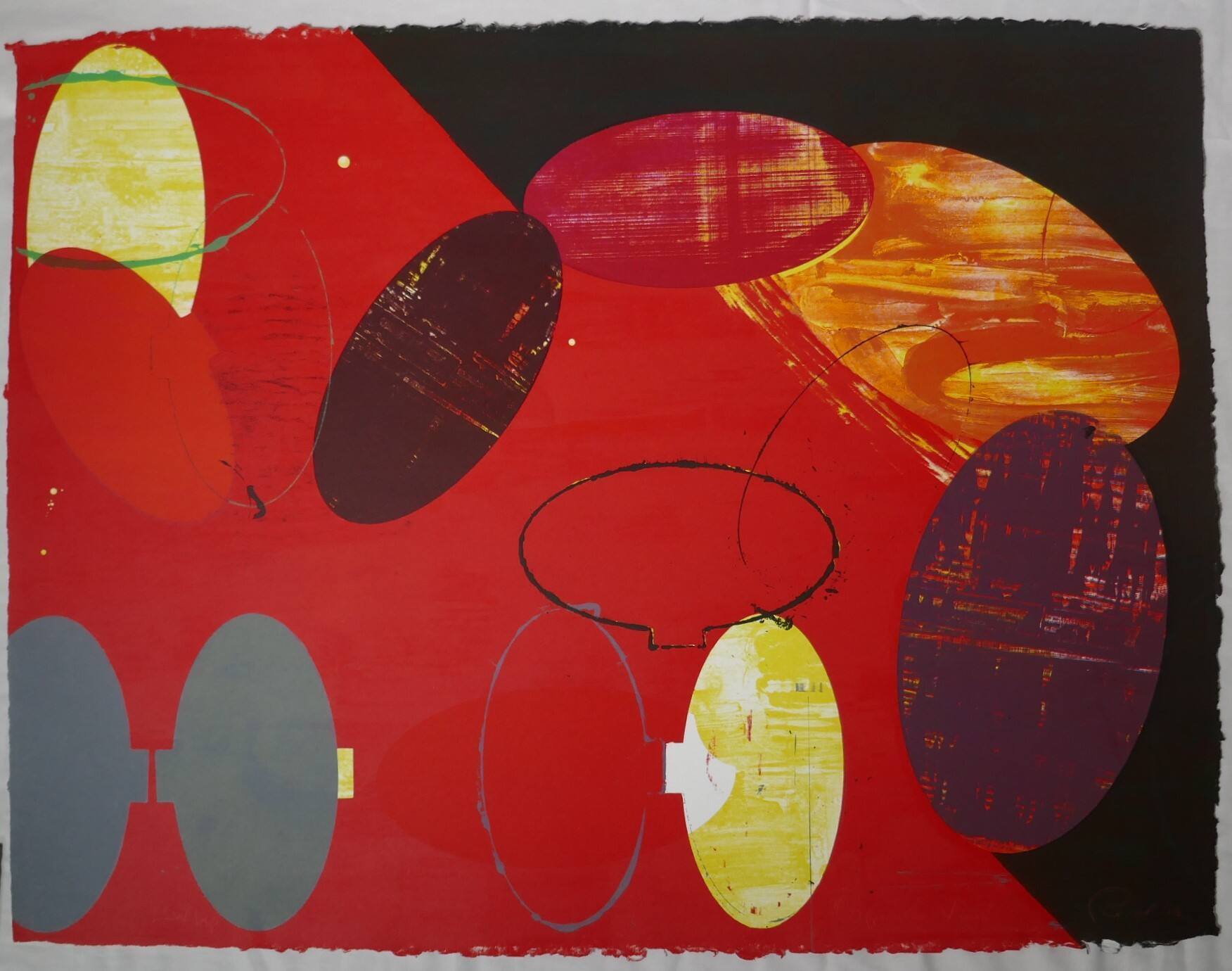 DescriptionIn the left two-thirds of the image, the background is red, with ovals set against it. Counterclockwise from upper left, yellow oval with two pale blue lines across it; a lighter red oval that cuts off part of the yellow one; two grey almost-linked ovals with a patch of yellow on the right side of the right one; a pale blue oval outline, a yellow oval; a dark blue horizonal oval outline; and a diagonal grey oval. Against the black background of the remaining part of the image, a purple horizontal oval at top partially covers the left part of a large yellow and orange oval. On the far right, an upright purple oval partially covers the lower edge of the large yellow and orange oval.ProvenanceC. Richard Belger and Evelyn Craft Belger, Kansas City, MO;
