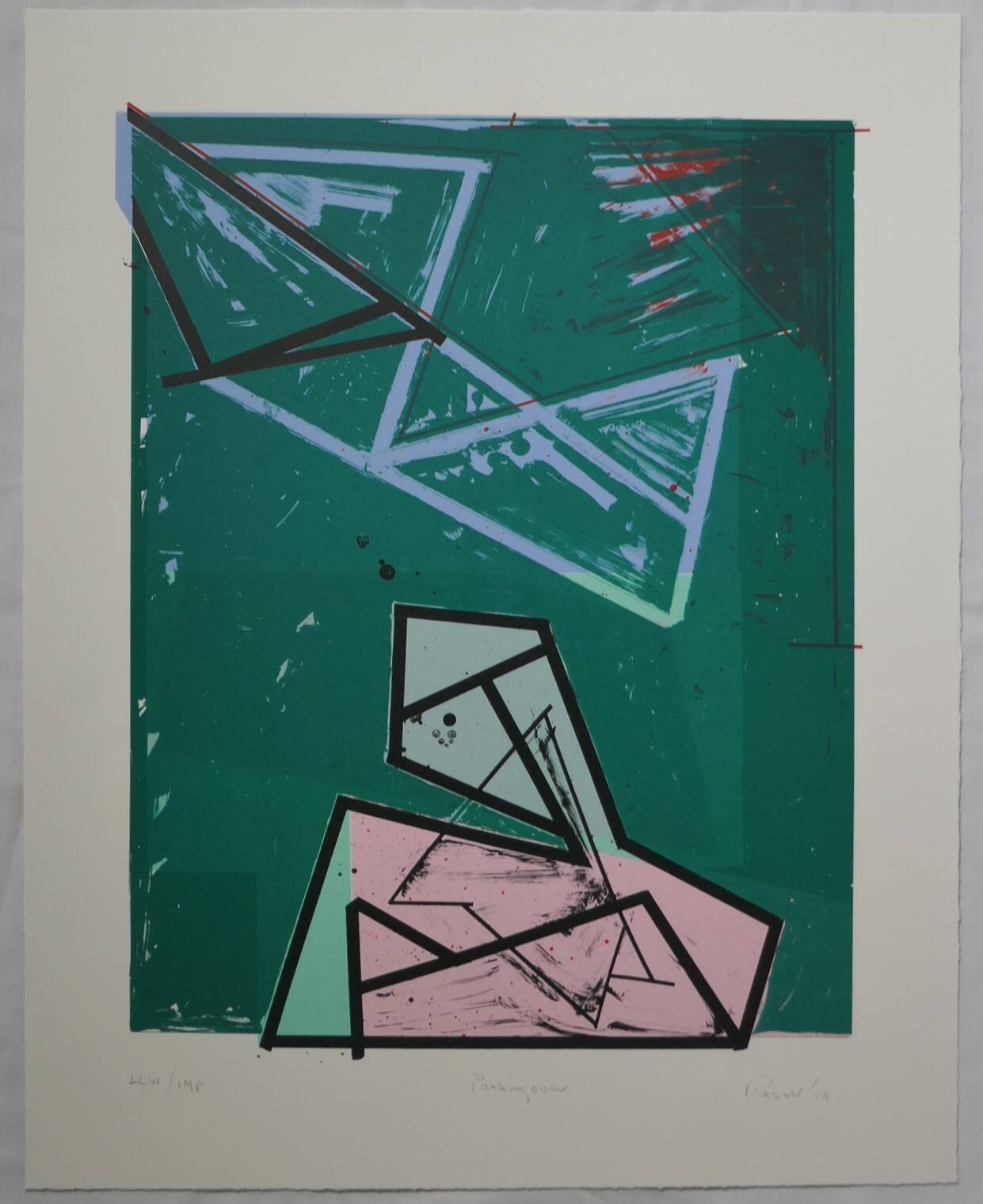 DescriptionColor print with an uneven deep green background flecked with light blue. At the bottom, intersecting pink geometric shapes outlined in black. Attached to them at left, a triangular light green shape outlined in black on the left and bottom. Rising from the pink shapes a pale blue kite shape outlined and intersected in black. In the upper half, intersecting geometric shapes outlined and partially filled in pale blue. Triangles outlined in thick black in the upper left corner. Strokes in pale blue and red next to a black rectangle in the upper right corner.ProvenanceC. Richard Belger and Evelyn Craft Belger, Kansas City, MO;