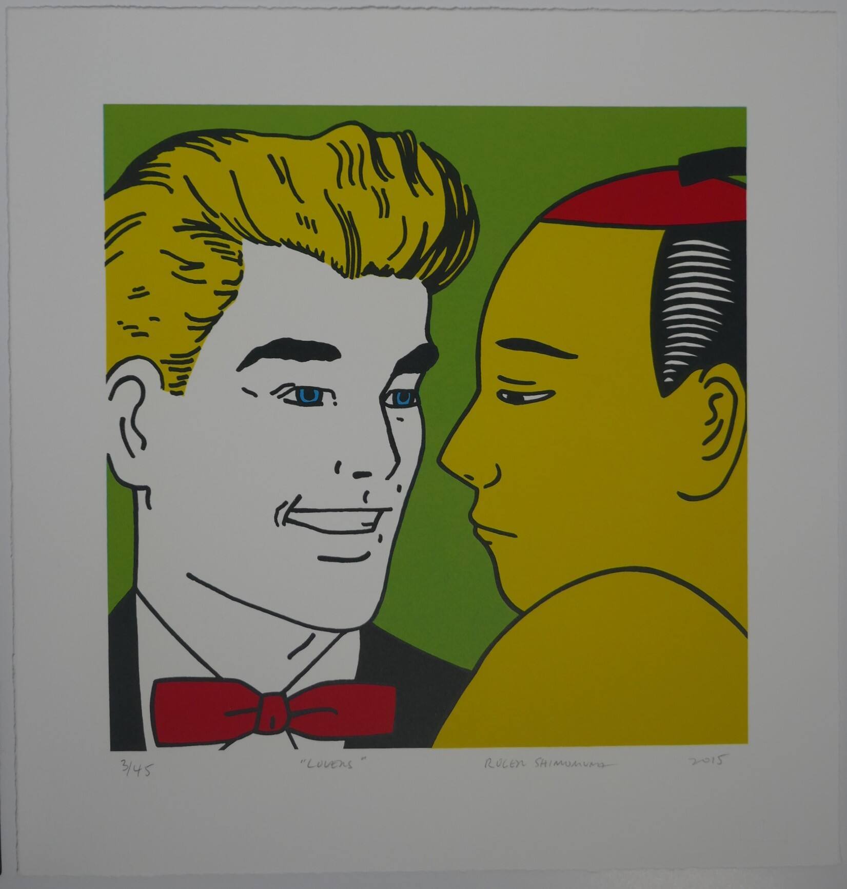 DescriptionOn the left, the head and shoulders of a smiling Caucasian man with yellow hair, blue eyes, and a red bowtie faces right. On the right, the profile of an unsmiling Japanese man with pale yellow skin and a red cap in his hair faces left. Pale green background.ProvenanceC. Richard Belger and Evelyn Craft Belger, Kansas City, MO;