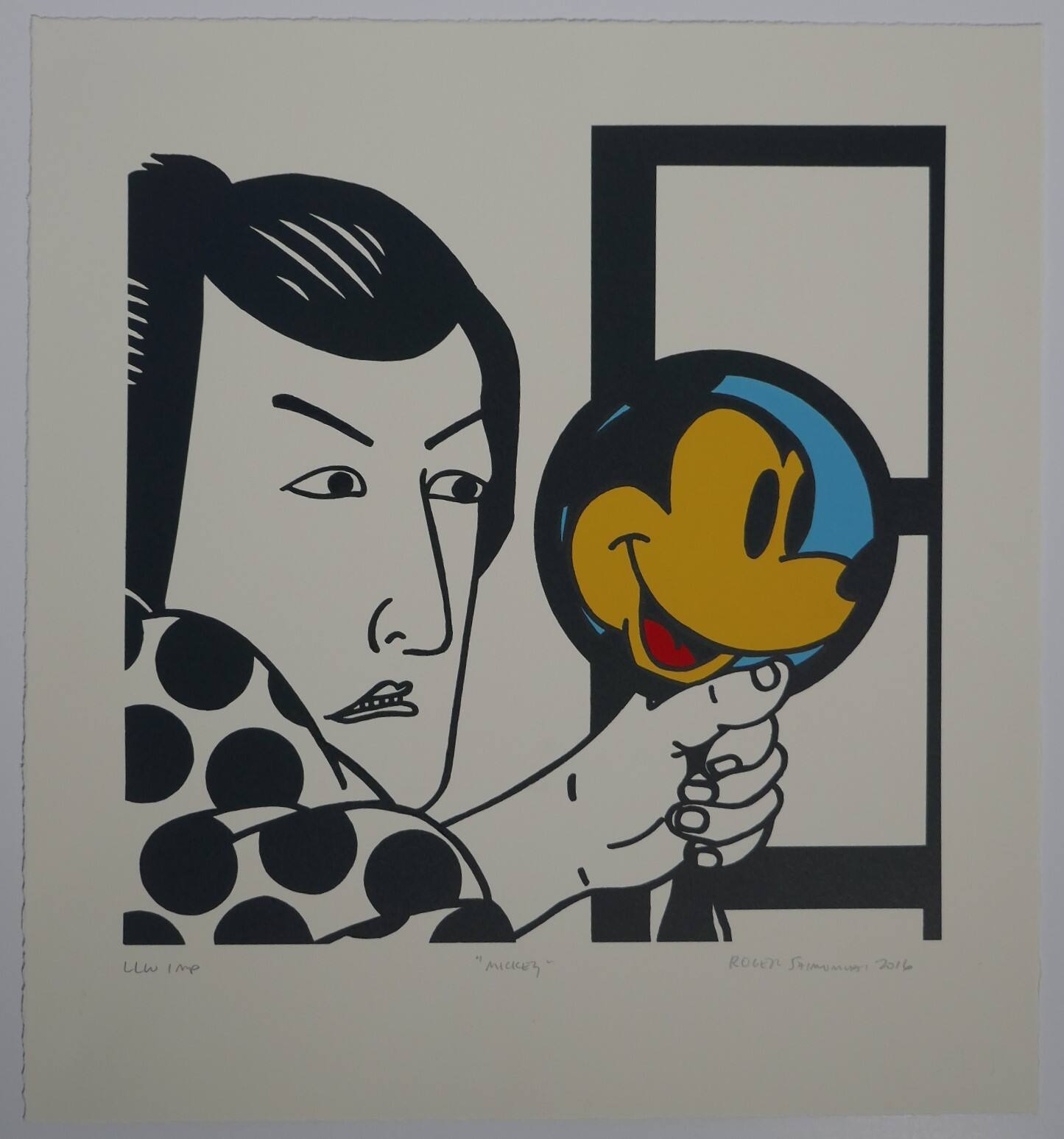 DescriptionKabuki actor on the left, facing right, holds a round mirror by the handle in his proper left hand. He wears a white robe with large black polka dots. He doesn’t look into the mirror but to the right, three-quarter face, with an upset expression, his lips slightly parted. The image in the mirror is the yellow head of Mickey Mouse with black hair and the suggestion of ears, a smiling mouth with a red tongue, against a blue background. Behind the hand and mirror, a window with two full and one partial pane.ProvenanceC. Richard Belger and Evelyn Craft Belger, Kansas City, MO;
