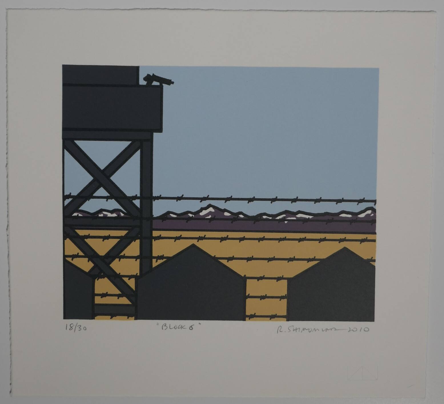 DescriptionIn the lower part, three dark brown houses with pitched roofs against five rows of barbed wire. A beige wall behind the wire is topped with a brown plank, with a sixth row of barbed wire above it. The outline of snowy mountains visible between the plank and the top wire. At the left, a watchtower, also in dark brown, with crisscross supports and a machine gun on top, aimed to the right.ProvenanceC. Richard Belger and Evelyn Craft Belger, Kansas City, MO;
