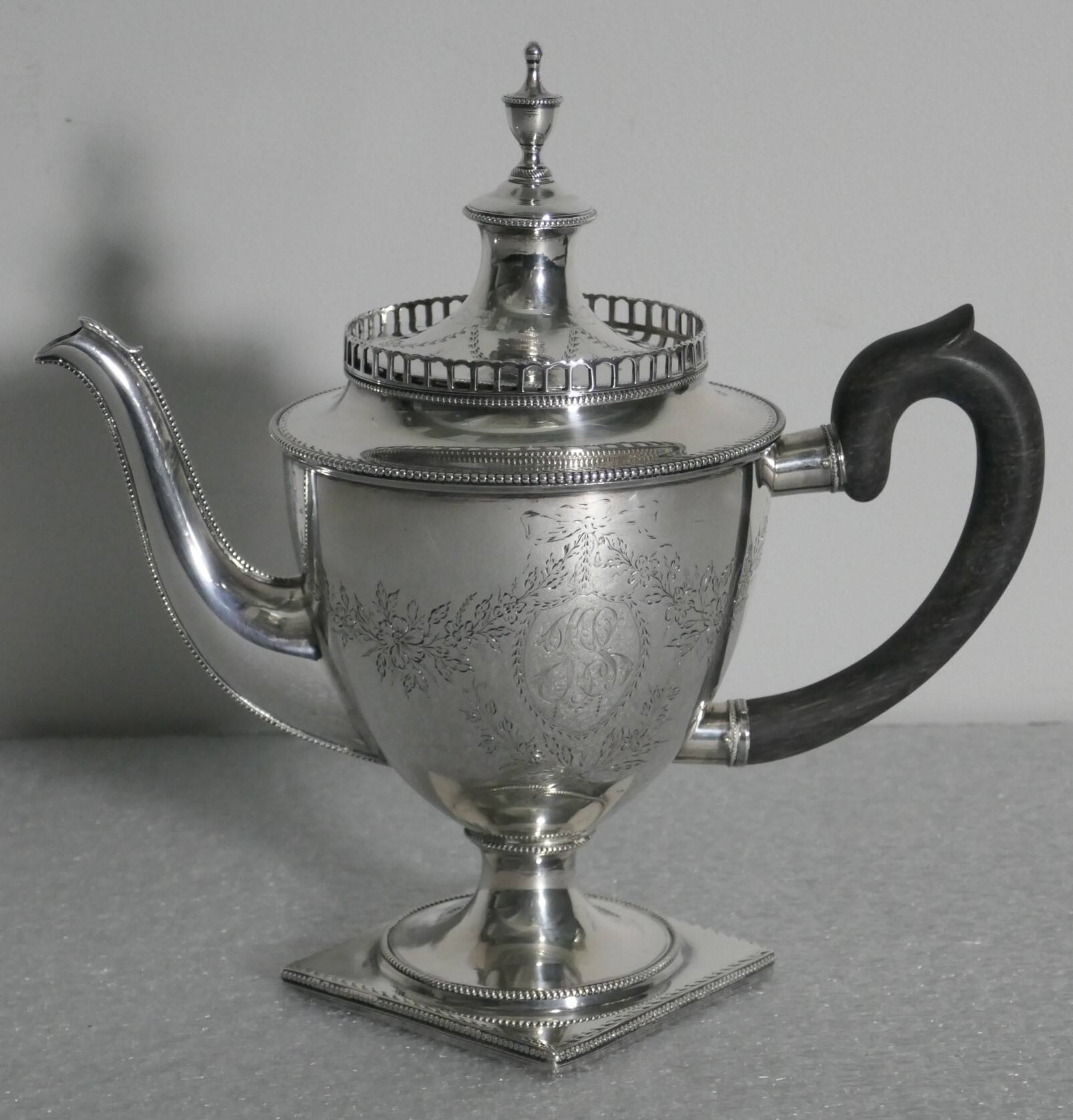 DescriptionSterling silver tea service comprising a galleried teapot, a galleried covered sugar bowl, a creamer and a waste bowl, all with bright-cut engraved floral wreaths and square plinth bases.Published ReferencesOn Dubois in general: